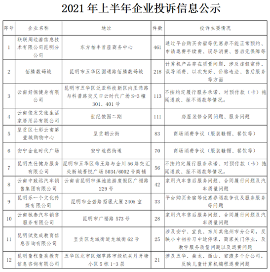 8月4日,昆明市市场监管局通报了2021年上半年12315诉求热点、热点行业。2021年上半年,昆明市12315接收公众诉求112875件,诉求总量同比增长18.49%。2021年上半年投诉举报平均办结率为98.50%,为消费者挽回经济损失3763.49万元。