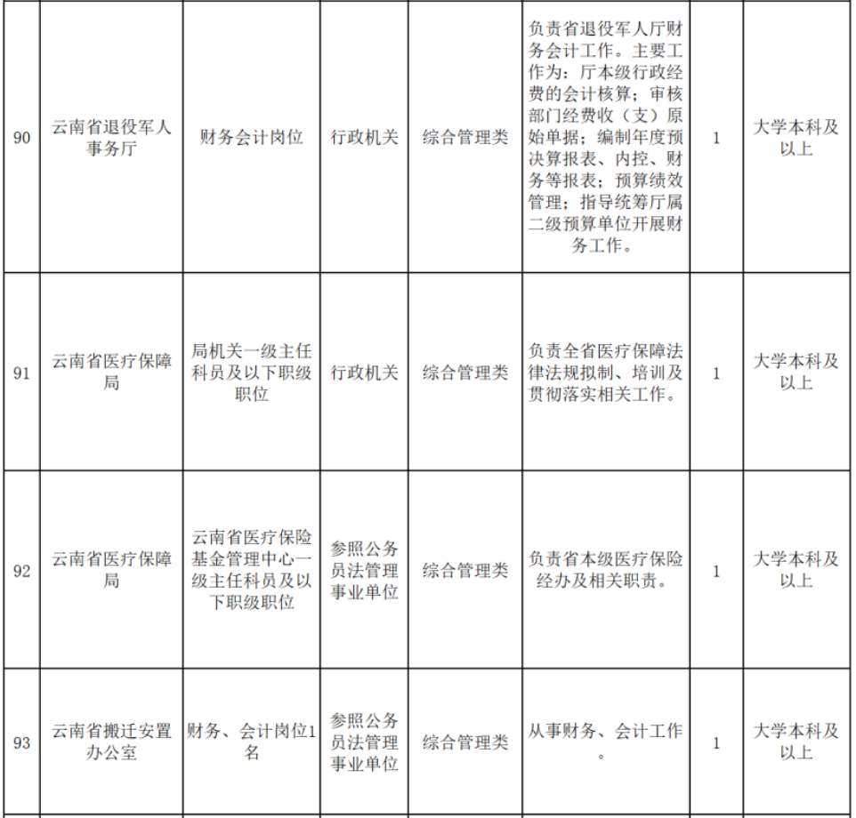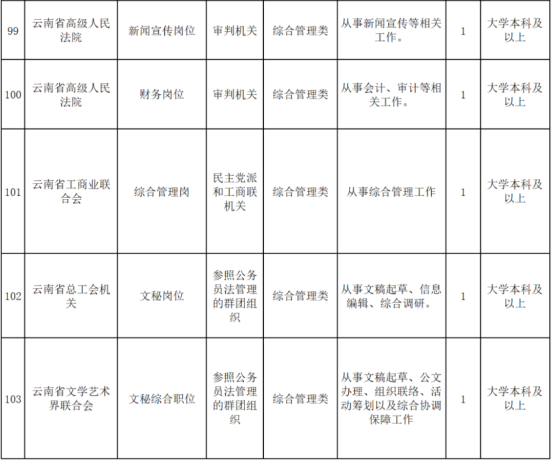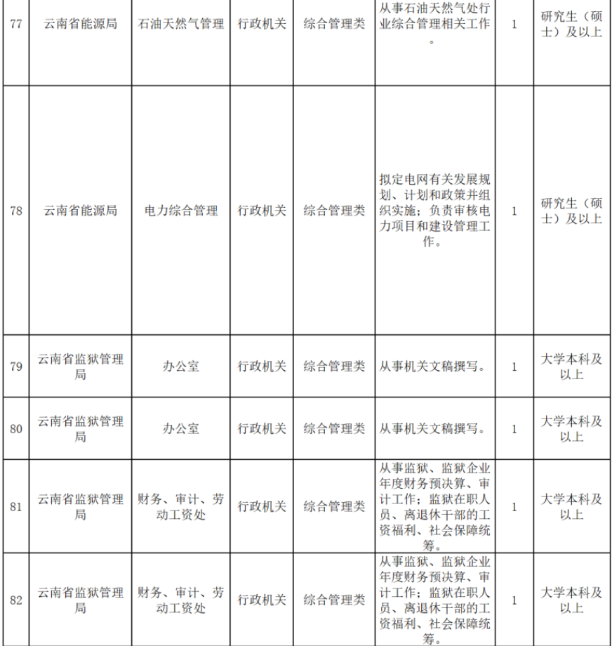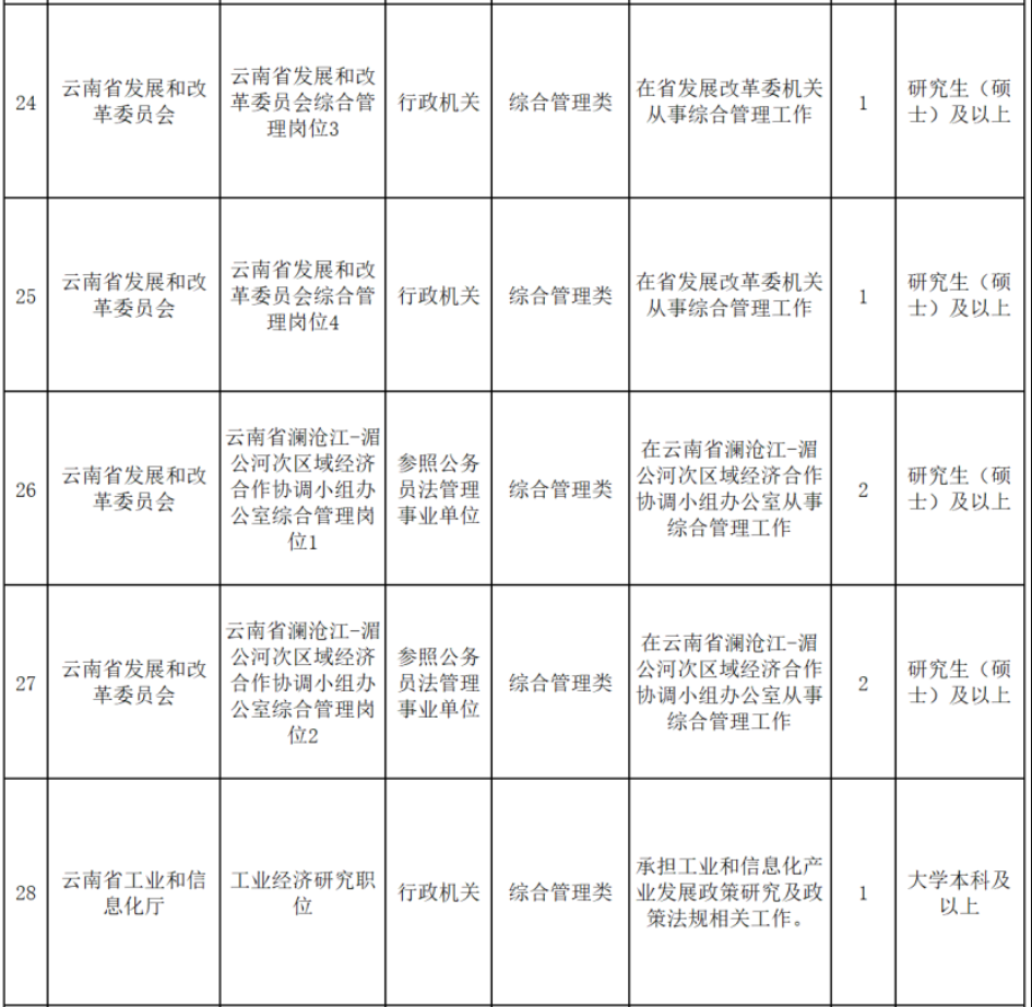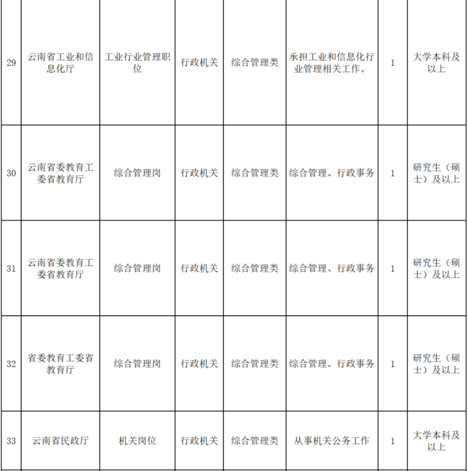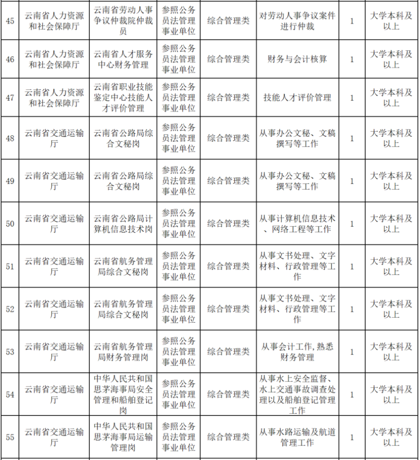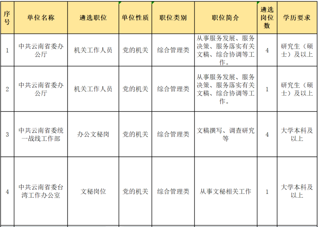 根据公务员法、公务员公开遴选办法等有关规定,云南省公务员局决定统一开展2021年下半年省级机关(含参照公务员法管理单位)公开遴选公务员(含参照公务员法管理单位工作人员)工作。现将有关事项公告如下:公开遴选职位为省级机关及参照公务员法管理单位一级主任科员及以下职级职位。详见《2021年下半年云南省省级机关统一公开遴选公务员职位表》(以下简称《职位表》)。1. 全省州(市)级及以下机关中已进行公务员登记备案且在编在岗、担任正科级及以下领导职务和一级主任科员及以下相当职级层次的公务员。2. 全省州(市)级及以下参照公务员法管理单位中已进行参照管理登记备案且在编在岗、担任正科级及以下领导职务和一级主任科员及以下相当职级层次的工作人员。3. 中央和省直机关设在我省州(市)级及以下的单位(包括垂直管理单位、派出单位等)符合报名条件的人员。(1)具有良好的政治素质、专业素养,品行端正,实绩突出,群众公认。(2)具有2年以上基层工作经历和2年以上公务员或参照公务员法管理单位工作人员工作经历;报名人员应符合在本级机关(单位)工作的最低年限要求;没有规定的,须在本级机关工作2年以上。上述基层工作经历,是指在县级及以下党政机关,村(社区)党组织或村(居)委会及其他经济组织、社会组织,各类企业、事业单位(参照公务员法管理的事业单位不在此列)的工作经历。军队转业干部在军队团和相当于团以下单位工作的经历或退役士兵在部队服役的经历,可视为具有基层工作经历。(5)年龄40周岁以下(1980年8月1日以后出生),具体以各遴选职位年龄要求为准。 工作经历年限、任职经历年限的计算时间截至 2021年8月,现任职务职级以报名前的任职为准。(3)涉嫌违纪违法正在接受有关专门机关审查尚未作出结论的。(4)受到诫勉、组织处理或者党纪政务处分等影响期未满或者期满影响使用的。(5)按照国家有关规定,到定向单位工作未满服务年限或对转任有其他限制性规定的。(6)尚在新录用公务员试用期、任职试用期或者提拔担任领导职务未满1年的。(7)原不具有公务员身份通过换届选举进入乡镇领导班子的乡镇事业人员、村(社区)干部、大学生村官、第一书记和驻村工作队员等人员,任期未满一届的。在公务员招考中,报考了艰苦边远地区县乡机关职位,并通过降低进入门槛等照顾政策录用的公务员(含参照公务员法管理人员),应当在所报考州(市)辖区内的艰苦边远县乡机关最低服务5年(含试用期),未满5年的,不得参加遴选。通过定向招录、专项招录以及特殊职位招录等录用的公务员(含参照公务员法管理人员),在招考时已被告知其应在招录机关或者招考职位服务最低年限的,应当严格履行约定。未满约定服务年限的,不得参加遴选。报名人员不得报考转任后即构成公务员法第七十四条所列回避情形的职位,也不得报考与本人有夫妻关系、直系血亲关系、三代以内旁系血亲关系以及近姻亲关系的人员担任领导成员的遴选机关的职位。公开遴选职位及岗位数、资格条件等详见《职位表》,报名人员在本公告发布之日起可以通过云岭先锋网查询(http://www.ynylxf.cn)。报名人员如需咨询《职位表》中的有关事项,可按《职位表》中公布的电话直接与遴选机关联系。采取报名人员个人意愿与组织推荐相结合的方式报名,可由公务员本人申请并按照干部管理权限经组织审核同意后报名,也可征得本人同意后由组织推荐报名。1. 组织推荐。报名人员登录云岭先锋网下载、填写并打印《2021年下半年云南省省级机关统一公开遴选公务员报名推荐表》(以下简称《报名推荐表》),由所在单位出具推荐意见并盖章后,按照干部管理权限将《报名推荐表》报任免机关(单位)组织人事部门审核盖章。组织推荐要坚持基层导向和队伍稳定相统一,保持适度规模,强化党组织推荐把关作用,着力推荐熟悉基层情况,符合上级机关要求的优秀人才。报名人员所在单位应对其政治素养、工作能力、工作作风等进行把关,对政治素质不过硬、作风不扎实、不担当、不作为、推诿扯皮、不专心工作的,不得推荐报名。2. 提交报名申请。网上报名时间为2021年8月13日9:00至8月17日18:00。报名人员登录云岭先锋网通过链接进入报名系统,进行网上注册,设置个人密码,通过报名系统上传本人近期2寸免冠正面证件照(照片文件应为JPG格式,照片宽度不低于295像素,高度不低于413像素),如实填写详细信息,填报职位,完成报名申请。用户名和个人密码是查询资格审查结果、下载打印准考证的依据,请报名人员务必牢记。3. 资料上传。报名人员将身份证、学历学位证书、审核盖章后的《报名推荐表》以电子文档的形式发至遴选机关指定邮箱,邮件标题格式为:“职位代码+姓名+身份证号”。每名报名人员限报1个遴选职位,多报无效;凡弄虚作假者,取消遴选资格。各遴选机关在收到报名人员《报名推荐表》后1日内完成资格审查,并通过报名系统反馈资格审查结果。未在规定时间内提交报名申请并上传《报名推荐表》的报名人员,各遴选机关不予资格审查。通过资格审查的,不能再改报其他职位。2021年8月13日9:00至8月17日18:00期间,报名申请未通过资格审查的,可改报其他职位。2021年8月17日18:00后,报名申请未审查或者未通过资格审查的,不能再改报其他职位。资格审查贯