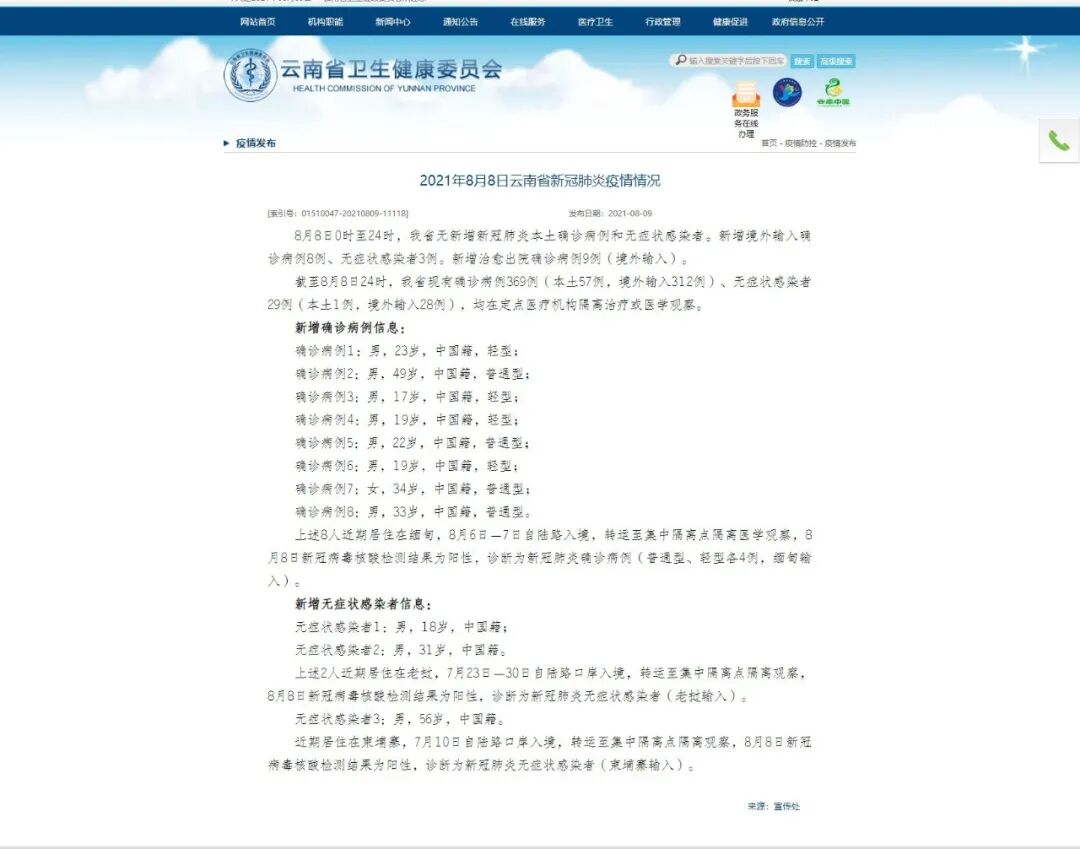 8月8日0时至24时,云南无新增新冠肺炎本土确诊病例和无症状感染者。新增境外输入确诊病例8例、无症状感染者3例。新增治愈出院确诊病例9例(境外输入)。