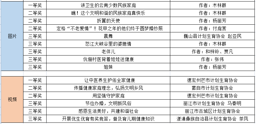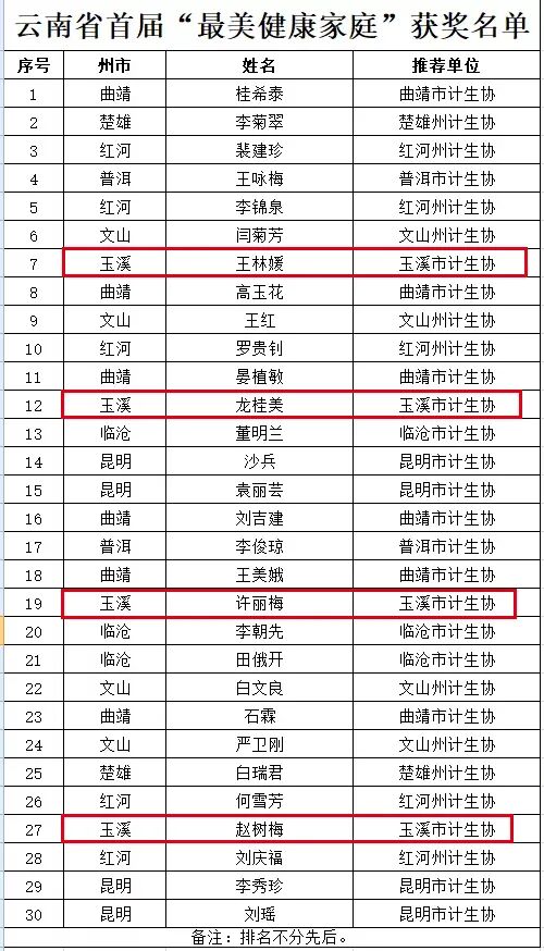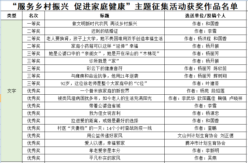 根据活动组委会专家评审组终评评定,主题征集活动中共有文字、图片、视频34个作品成为最终“赢家”;在云南省计生系统“最美健康家庭”的评选中,来自楚雄、红河、昆明、临沧、普洱、曲靖、文山、玉溪这8个州市的30个健康家庭中选。
