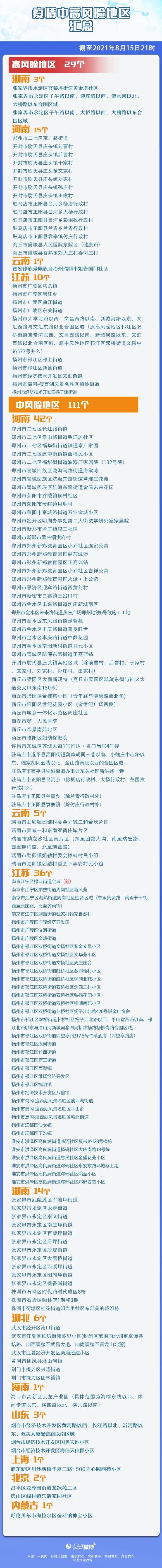 自8月13日0时起,湖南省株洲市云龙示范区学林街道学府港湾小区和锦绣香江小区,湘潭市雨湖区云塘街道杨家湾公安小区风险等级调整为低风险。湖南湘潭市中风险地区清零。