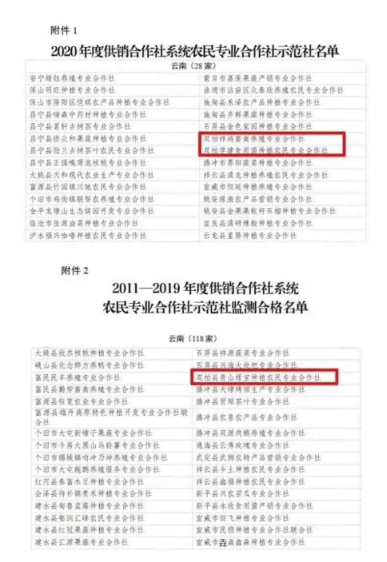 近日,中华全国供销合作总社公布了2020年度供销合作社系统农民专业合作社示范社名单和2011—2019年度供销合作社系统农民专业合作社示范社监测合格名单,双柏县3家农民专业合作社榜上有名。