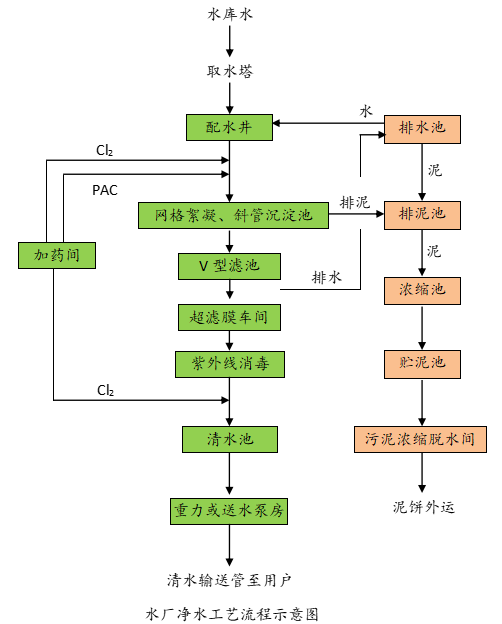 水厂处理工艺为网格絮凝-斜管沉淀-V型滤池-超滤-消毒。