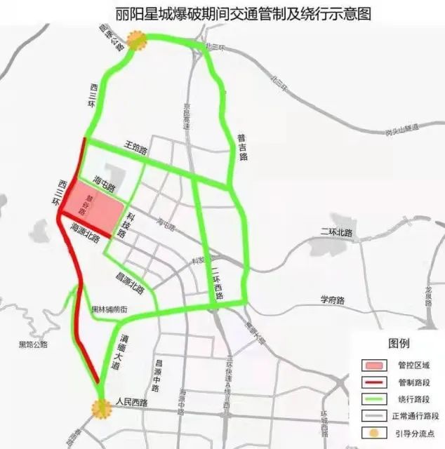 经昆明市公安局行政许可事项批准决定书(云公爆决字0000002469号)批准,昆明西山土地房屋开发经营(集团)有限公司将于2021年8月27日对丽阳星城二期A1\A3\A4地块建筑进行爆破拆除,为确保爆破期间市民生命财产安全,依据《中华人民共和国道路交通安全法》第三十九条之规定,爆破期间将对片区部分道路实施临时交通管制,现就相关事宜通告如下:一、管制时段:2021年8月27日13:00至17:00。二、管制对象:(一)管制时段内所有机动车、非机动车、行人禁止在:西北三环(含)、海源北路(含)、科技路(不含)、海屯路(不含)围合区域内道路通行。(二)管制时段内所有机动车同时禁止在:西北三环(滇缅大道至筇王路)通行。三、需要途经管制区域道路的市民请提前规划出行路线,由周边滇缅大道、普吉路、二环西路等道路绕行;途经管制区域周边道路的车辆驾乘人员及行人请服从现场人员的指挥,安全有序通行。