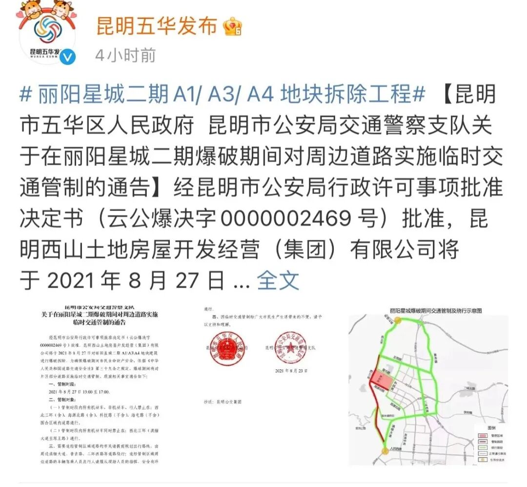 8月23日,昆明市五华区委、区政府官方微博发布消息,昆明市五华区人民政府、昆明市公安局交通警察支队发布关于在丽阳星城二期爆破期间对周边道路实施临时交通管制的通告,昆明西山土地房屋开发经营(集团)有限公司将于2021年8月27日对丽阳星城二期A1\A3\A4地块建筑进行爆破拆除。爆破期间,将对片区部分道路实施临时交通管制