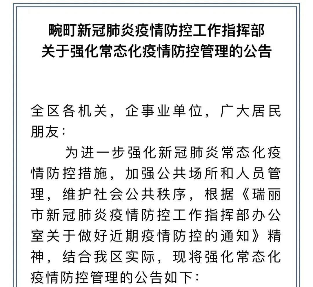 公告还要求,入畹人员凭有效身份证件或单位证明及72小时内核酸检测阴性证明,扫“德宏抗疫情”场所码进入,并及时向所在社区网格员报告。各类货运车辆进出严格实行闭环管理。