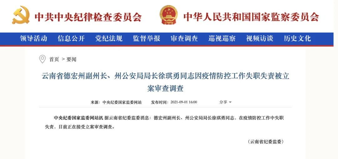徐琪勇并非德宏首个因疫情防控不力被查的厅级干部。今年3月,时任德宏州委常委、瑞丽市委书记龚云尊,因在疫情防控工作中严重失职失责被撤职,并降为一级调研员。