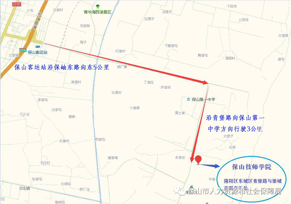 2.考生在进入考点前需进行体温检测,请考生在考点入口等候检测时服从工作人员安排,遵守秩序,排队进行检测,不能吵嚷、打闹,影响检测入场。凡隐瞒或谎报旅居史、接触史、健康状况等疫情防控重点信息,不配合工作人员进行防疫检测、询问等造成不良后果的,取消考试资格,终止考试;如有违法情况,将依法追究法律责任。参加考试人员如因有相关旅居史、密切接触史等流行病学史被集中隔离,笔试当天无法到达考点的,视为主动放弃考试资格。3.对考前或考试时出现身体状况异常,经复测复查确有发热、咳嗽等呼吸道异常症状的考生,由驻点医疗防疫人员进行个案研判,具备继续考试条件的考生转移至备用隔离考场考试。对不能排除新冠肺炎的,一律由120负压救护车转运至定点医院就诊排查。4.请参加考试人员注意个人防护,参加考试人员进入考点内,除核验信息时须配合摘下口罩以外,考试全程均应佩戴一次性医用口罩。5.本次考试不统一配发文具,考场内配备时钟,请考生自备文具,只能携带黑色墨水(中性)笔、橡皮、2B铅笔。除规定文具、准考证、身份证外,严禁将各类手表和各种电子、通信、存储设备(如各类手机、电子手环等)及资料等物品带入考场。考试桌面一律不得摆放其他物品,考生其他物品统一放置在考场门口柜子或桌子上(电子设备、通讯设备必须全部切断电源,关闭闹钟;考生如未带包,其手机等物品由本人自行装入信封并在信封上填写本人姓名后用订书机封装)。特别提醒考生:尽量不要穿戴含有金属的衣物或饰品;尽量不要携带贵重物品,以防丢失。 6.关于考生进考场及退考场的规定:考生未带身份证或身份证过期,一律不得进入考场。考生必须带齐准考证、本人有效身份证,在开考前60分钟起进入考场,开考30分钟后,考生一律不得进入考场;考试结束以前考生不得提前交卷、退场。7.本次笔试内容为:综合能力测试。试卷启封后,考生不得上卫生间;仍坚持要上的,上卫生间后不能再进入考场参加考试,且需要到考生休息室封闭至考试结束才能离开考点。8.开考后,考生不得传递任何物品。考生接到试卷后,先检查试卷和答题卡是否完整,考试科目是否正确。如遇试卷分发错误、页码序号不对、缺页、字迹模糊或答题卡分发错误、有折皱、严重污染、破损等问题,应及时举手向监考人员报告,严禁擅自使用、更换他人的试卷、答题卡和草稿纸,不得要求监考人员解释试题。9.考生须在试卷、答题卡和草稿纸规定位置,用黑色墨水(中性)笔准确、完整填写本人姓名和准考证号等信息,用2B铅笔准确、完整填涂准考证号等信息。答题前,须仔细阅读试卷及答题卡上的注意事项,按要求作答。除规定填写内容外,不得在答题卡及准考证正反面上做任何标记。不能在规定开考时间前答题,不能在考试时间结束后继续答题。考试结束铃响,考生须立即停止答题,将试卷、答题卡分别反面向上放在桌面上,等待监考人员收集、清点完试卷、答题卡和草稿纸并确认无误后,考生方能离场。严禁带走试卷、答题卡和草稿纸。10.考生考试时请保持正确的姿势作答,严禁随意侧身、转头、左顾右盼,并有义务妥善保管好自己的试卷和答题卡,防止被他人抄袭。《中华人民共和国刑法修正案(九)》和《公务员考试录用违纪违规行为处理办法》(人社部令30号)等法律法规是考试纪律红线,请各位考生严格遵守。不带违禁物品,不做违纪之事,不抱侥幸心理,不搞作假舞弊,坚决抵制一切形式的作弊行为;不得窃取、传播考试试题,不参与网上不负责任的议论。对有作弊行为,无理取闹,威胁、侮辱、诽谤、诬陷工作人员或有其他违纪违规行为的考生,将按《公务员考试录用违纪违规行为处理办法》和相关法律法规严肃处理。考试期间,公安机关、无线电管理等部门将严密监控考场及周边环境,严厉打击考试作弊行为。作弊入刑,作弊记入个人征信。一次作弊,耽误终生、后悔一生!请考生自觉远离考试违纪违规高压线。考试结束后,人事考试管理部门将采用技术手段对答题情况进行雷同鉴定,鉴定为答卷雷同的,双方均取消考试成绩,并将依照相关规定严肃处理。请各位考生认真阅读本人准考证上的考点、考场号和座位号,不要走错考场(教室)或坐错座位。建议考生合理安排食宿,合理选择并提前预订酒店,带好雨具,提前1天熟悉考点位置和交通路线,考试当天提前到达考点,避免因天气变化、交通拥堵、不熟悉路况等原因耽误考试,造成遗憾。考点学校不提供停车场所,请考生妥善安排交通工具。2021年下半年云南省省级机关统一公开遴选公务员笔试保山考区考点设在保山技师学院7号楼,地址:保山市隆阳区永盛街道大堡子社区青堡路与堡城南路交汇处,考生由南门进入。位置示意图如下: