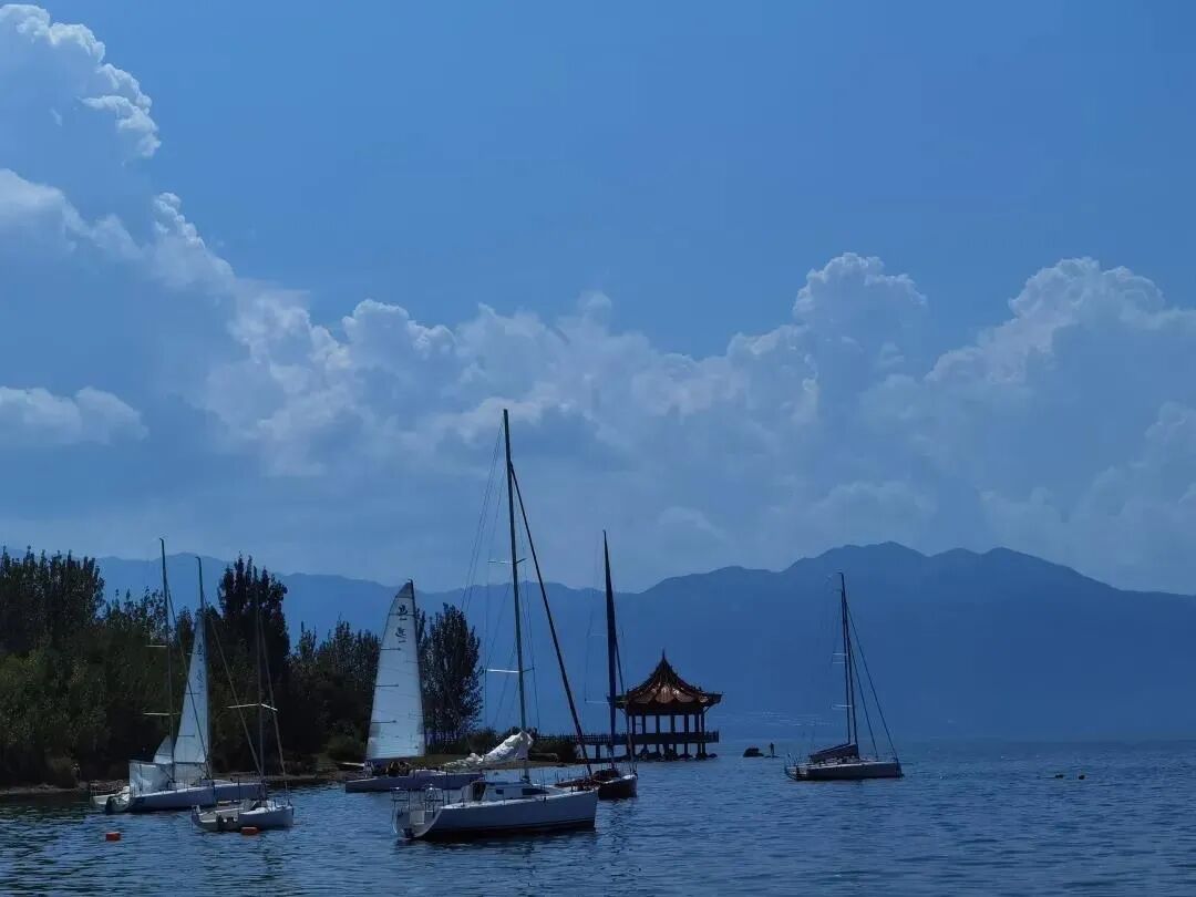 帆船,是依靠自然风力作用于帆上而推动前进的船只,帆船运动作为一项水上运动,因其航行动力均借助于可再生资源,是一种绿色健康的体育项目。实践团队来到云大校友企业家邓新强先生创办的抚仙湖帆船基地。在学习帆船运动的相关知识后,团队便跟随教练一起前往湖中,感受抚仙湖的清风与深蓝。在船上,同学们充分感受到抚仙湖的清透水质,赞叹澄江市对于生态保护的规划与重视,绿色健康的帆船运动与中国最深淡水湖泊完美结合,也更好地让更多人了解、参与了帆船运动和帆船文化传播,倡导人们崇尚环保崇尚洁净的参与水上运动,关爱湖泊水源,爱护周边环境,并依托良好的生态环境,推动绿色可持续发展,澄江真正做到了在发展中保护,在保护中发展。结束愉快的水上之旅后,同学们与邓新强学长合影留念,并对邓学长致力健康公益,关爱云大后学的精神致以敬意和感谢。