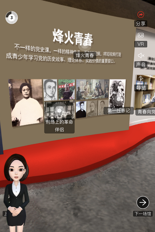 据介绍,昆明市党史学习教育3D云展馆由中共昆明市委党史学习教育领导小组办公室、中共昆明市委宣传部指导,昆明报业传媒集团研发。通过大量珍贵史料、丰富的党史学习教育音视频,模拟了真实参观场景的设计,还原了线下最佳观展路线和观展位置,一进入3D云展馆,耳边就响起了关于展馆的语音讲解。手指轻轻滑动,便可以360度观赏全景。展馆两侧是精致的浮雕墙,点击墙上的动图原点,即可查看详细介绍,点击右下角的引导箭头,便可跳动到下一个展馆。无论是每个单元的简介,还是一张小小的照片,都可以找到清晰合适的观赏位置。