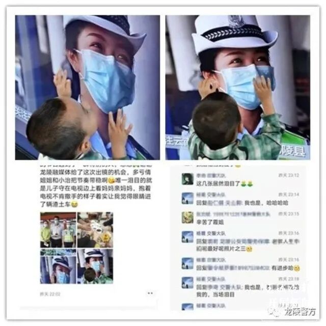 民警杨霞在采访时说:“现在是非常时期,我们作为人民警察,必须要把人民群众的生命财产安全作为第一位,况且有那么多的人陪在我们身边,我们并不孤单,我相信孩子长大以后肯定会理解我的。”
