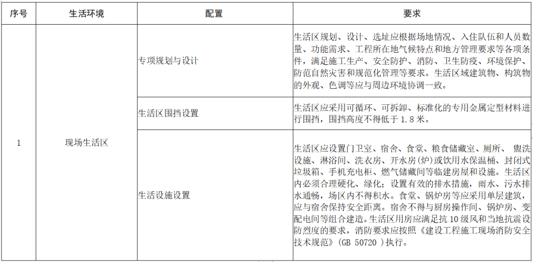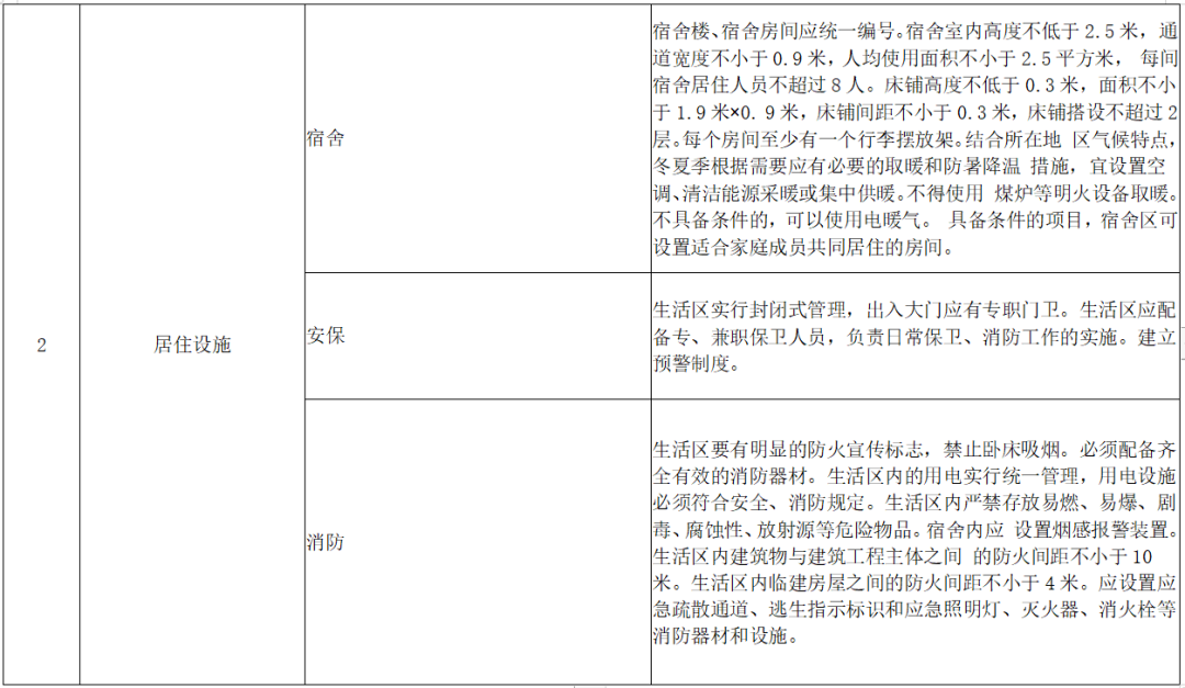 根据有关要求及工程实际配置空调、淋浴等设备,保障水电供应、网络通信畅通,达到一定规模的集中生活区要配套食堂、超市、医疗、法律咨询、职工书屋、文体活动室等必要的机构设施,鼓励开展物业化管理。