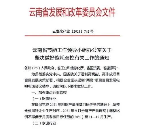 广西出台了新的双控措施,要求从九月份开始,对电解铝、氧化铝、钢铁、水泥等高耗能企业实行限产,并给出了明确的减产标准。