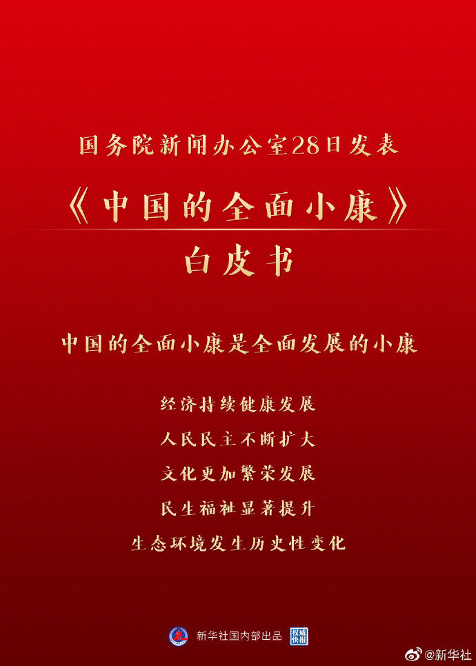 国务院新闻办公室28日发表《中国的全面小康》白皮书。100年来,中国共产党团结带领中国人民顽强拼搏,几代人一以贯之、接续奋斗,从“小康之家”到“小康社会”,从 “总体小康”到“全面小康”,从“全面建设”到“全面建成”,小康目标不断实现,小康梦想成为现实。