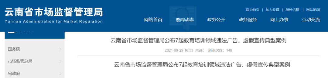 今年以来,云南省各级市场监管部门深入贯彻落实整治群众身边腐败和不正之风以及“双减”工作要求,加强教育培训广告、商业宣传监管,加大执法力度,依法查处了一批教育培训领域违法广告、虚假宣传案件。为充分发挥社会舆论监督,强化典型案例警示震慑作用,保护消费者合法权益,日前,云南省市场监管局公布7起违法广告、虚假宣传典型案例。