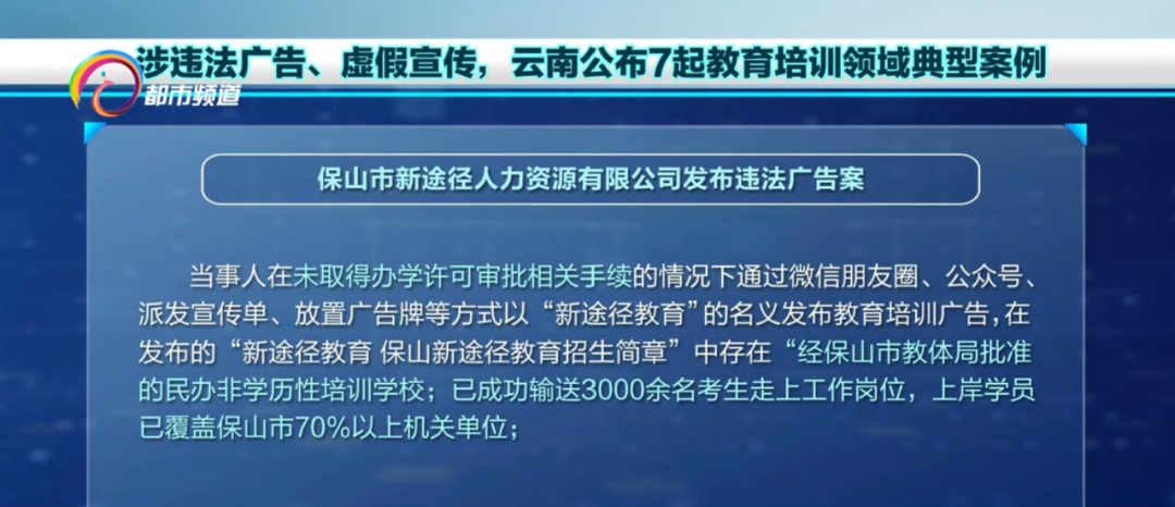 保山市新途径人力资源有限公司当事人在未取得办学许可审批相关手续的情况下,通过微信朋友圈、公众号、派发宣传单、放置广告牌等方式以“新途径教育”的名义发布教育培训广告,在发布的“新途径教育 保山新途径教育招生简章”中存在“经保山市教体局批准的民办非学历性培训学校;已成功输送3000余名考生走上工作岗位,上岸学员已覆盖保山市70%以上机关单位;是目前保山市办学规模最大,在校学生最多,历年上线率最高的培训学校”以及“2018-2020年腾冲航帆培训学校部分光荣榜”等虚假及无法证实的引证内容,其行为违反了《中华人民共和国广告法》相关规定,保山市隆阳区市场监管局责令当事人改正违法行为,处予罚款50000元。