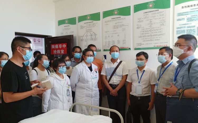 随后专家组到现场查看了胸痛救治单元相关文件、相关制度流程、数据填报、人员培训运作情况及建设成效,同时到胸痛救治诊室、抢救室等科室进行现场核查,并进行了现场演练。专家随机抽考了值班医师对急性胸痛相关知识的掌握和运用,并查看了卫生院现场模拟演练。