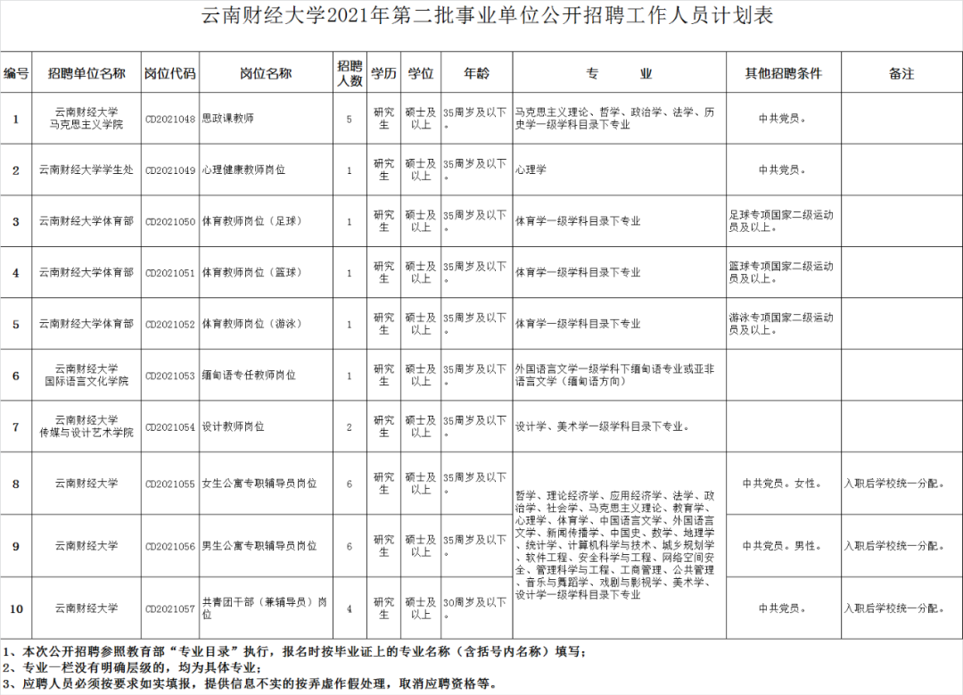 根据《云南省事业单位公开招聘工作人员办法》(云人社发〔2016〕182号)等有关文件规定,结合工作需要,经云南省教育厅、云南省人力资源和社会保障厅批准,云南财经大学计划面向社会公开招聘事业编制人员28名。招聘工作坚持“公开、平等、竞争、择优”的原则,德才兼备的标准,严格按照事业单位公开招聘流程进行。3.具有硕士研究生或以上学历学位,符合本公告相关岗位招聘条件和其他要求。须在2021年12月31日前获得岗位要求的学历学位证书(海外学历学位须出具教育部认证报告)。5.年龄35周岁及以下(1986年10月1日以后出生)。其中共青团干部(兼辅导员)岗位须30周岁及以下(1991年10月1日后出生)。受党纪、政纪处分期限未满或正在接受纪律审查的人员,受到刑事处罚期限未满或者正在接受司法调查尚未做出结论的人员,均不得参加应聘。本次公开招聘28人,均为事业编制。具体招聘岗位及招聘条件,详见附件《云南财经大学2021年第二批事业单位公开招聘工作人员计划表》。本次公开招聘考试在云南人才网(www.ynhr.com)进行网络报名,不接受现场、邮件或电话等报名方式。每人限报一个岗位。应聘人员可登录云南人才网按以下流程进行报名:登录云南人才网→进入报名界面,按报名系统提示填写注册信息→上传近期清晰免冠近照的电子照片→填写报名信息→仔细核对报名信息并确认后提交审核→等待审核→审核通过后网上缴费→缴费成功后打印准考证。2021年10月18日09:00至10月21日18:002021年10月19日09:00至10月22日18:002021年10月19日09:00至10月23日18:002021年11月4日09:00至11月5日24:00暂定于2021年11月6日举行,具体日期和地点详见准考证。报名资格审核由云南财经大学负责,采用计算机审核和人工审核相结合的方式进行。应聘人员须按要求如实填报有关信息和材料,报名时所填专业须按照毕业证上的专业名称填写(含括号内的专业方向)。通过报名资格审核的人员,报名信息不允许做任何修改。请务必在提交报名信息前认真核对,确保信息无误。凡提交报名信息不准确、不真实的,造成的一切后果由应聘人员自己负责。应聘人员填报信息不实的,按弄虚作假处理,取消本次考试资格;应聘人员弄虚作假或以其他不正当手段获取考试资格者,取消本次考试资格。1.应聘人员资格初审通过后,须于2021年10月23日18:00前完成交费。按照省发展改革委、省财政厅关于事业单位应聘人员资格考试收费标准,每人缴费100元,由云南省人才市场统一收取。2.通过资格初审缴费成功的应聘人员须于2021年11月5日24:00前登录云南人事考试网打印准考证。按照规定,每个岗位报名人数与计划招聘数的比例不低于3:1方可组织开考,未达到比例的相应递减招聘岗位或人数。个别紧缺、特殊岗位达不到开考比例的,经云南省教育厅、云南省省人力资源和社会保障厅批准,方可开考。招聘计划裁减或变更公告在云南财经大学网站进行公布,取消岗位考生报名费将在报名结束,由收费单位清账完毕后从原缴费渠道退还。笔试考试科目为综合基础知识和高教教育学基础类知识两科,两科合卷,各占50%,采取闭卷的方式进行,笔试满分100分。笔试时间和地点以准考证为准,应聘人员须凭准考证和身份证原件按规定时间到指定考场参加笔试。笔试成绩于考试结束后3个工作日内,在云南财经大学网站通知公告栏公布。面试前,每个岗位根据应聘人员笔试成绩从高到低按3:1的比例确定拟进入面试人选进行资格复审。未在规定时间地点参加资格复审或资格复审不合格者,取消考试资格。资格复审时应聘人员需提供下列原件并留存复印件:身份证、学历学位证明材料、中共党员证明(部分岗位)、二级运动员证书(部分岗位)、报考岗位需要的其他证明材料。原件当场查验完毕交还本人,复印件学校留存不再退还。资格复审时间、地点和相关要求于笔试成绩发布后在云南财经大学网站“通知公告栏”中公布。面试主要考察应聘人员专业技能及适应岗位要求的相关业务素质与工作能力等。面试分为心理测试和专业测试。心理测试由专业人士使用心理测评量表对进入面试人员进行心理健康评估。专业测试主要考察应聘人员适应岗位要求的综合能力和实际操作能力。面试成绩满分为100分,最低合格分数线为70分,未达到面试成绩最低合格分数线的应聘人员,不得进入后续程序。面试人员名单、面试方式、时间、地点在云南财经大学网站“通知公告栏”中公布。按综合成绩从高到低顺序与岗位拟招聘人数等额确定考察人员(综合成绩=笔试成绩×50%+面试成绩×50%,满分为100分。若综合成绩相同,按面试成绩排序)。考察由人事处组织实施,重点考察应聘人员的思想政治表现、道德品质、管理教学水平等情况。考察合格,由人事处汇总报学校会议审定。考察合格人员到指定医院体检,体检标准参照《公务员录用体检通用标准(试行)》执行。如体检不合格者,不予聘用。拟聘人员名单在云南财经大学人事处网页公示七个工作日。公示期满无异议的,按相关规定办理聘用手续。在职人员如原单位不同意解除聘用合同影响入职手续办理,由应聘人员本人负责。本次招聘的事业编制工作人员,其管理和待遇按照国家和云南省事业单位相关规定执行。1.本次公开招聘公告通过云南省人力资源和社会保障厅、云南财经大学官方网站发布,后续信息