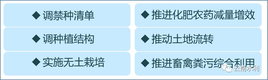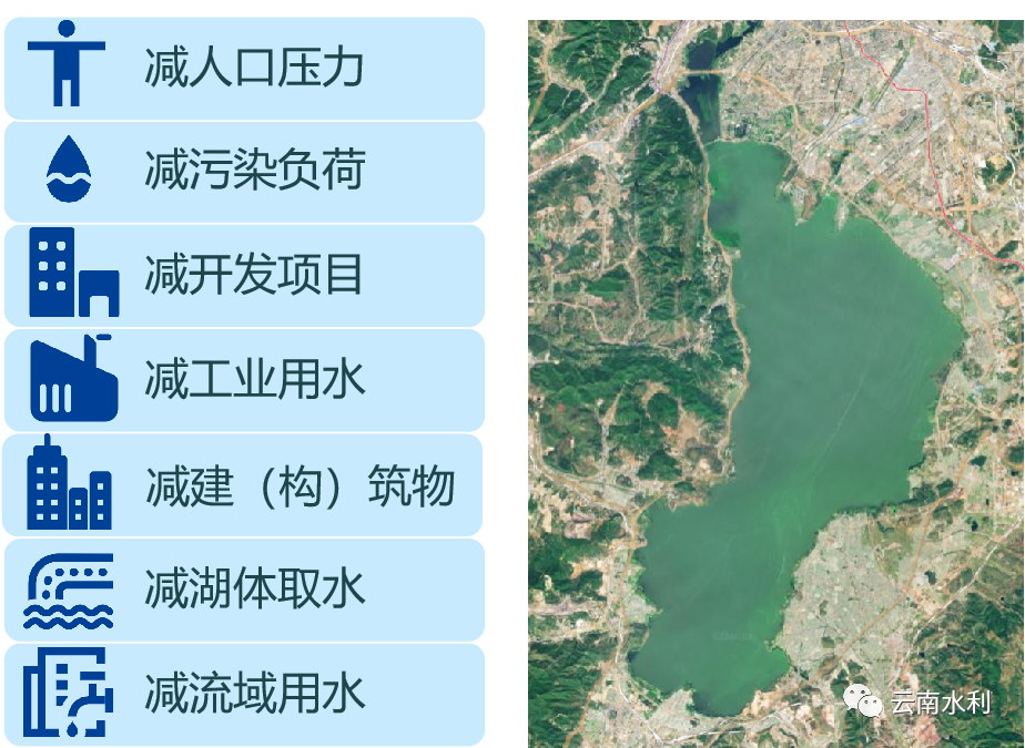 减:“以水定城、以水定地、以水定人、以水定产”,九大高原湖泊流域内全面减少项目开发,减轻人口压力,减少资源浪费。