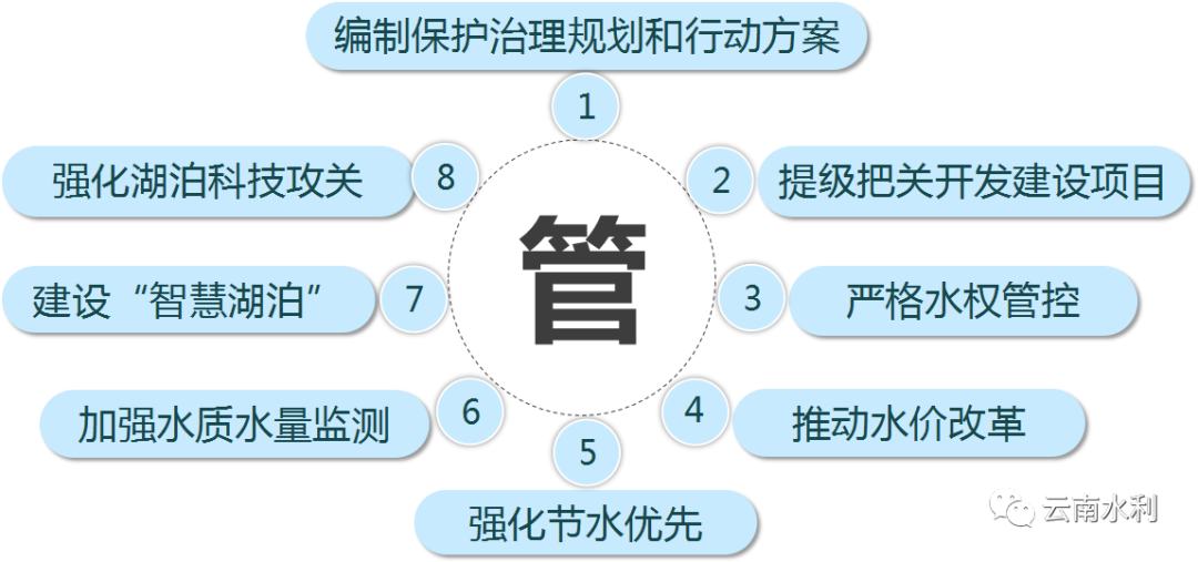 管:坚持规划引领,严格空间管控;推进水价改革,促进节约用水;遵循自然规律,坚持科学管湖。