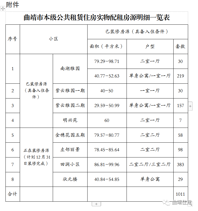 根据《曲靖市人民政府办公室关于推进公共租赁住房分配运营管理工作的实施意见》及有关规定,曲靖市保障性住房建设投资开发有限责任公司南湖雅园、紫云雅园、明兴苑等公共租赁住房启动招租,现将有关事项公告如下: