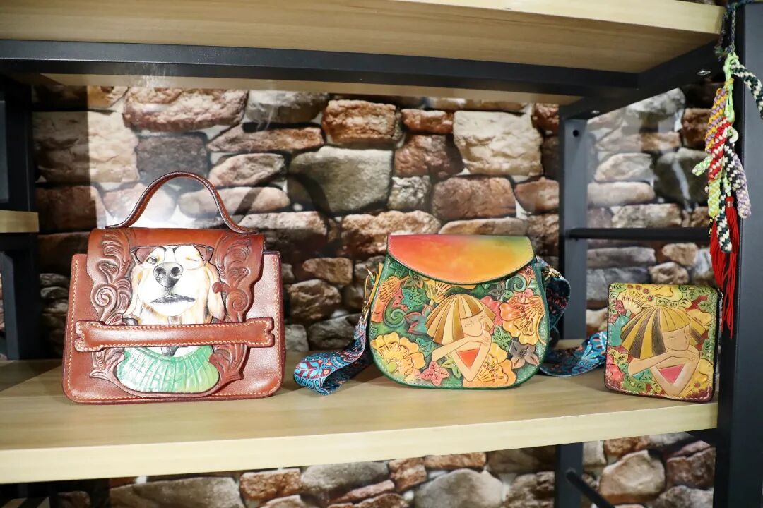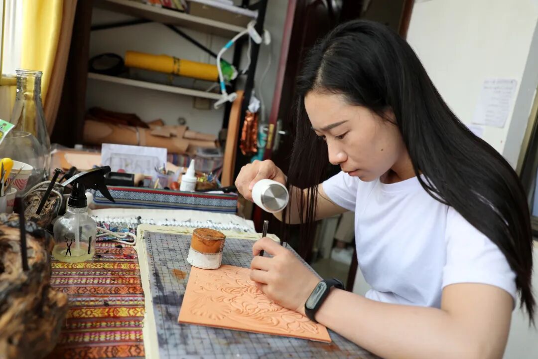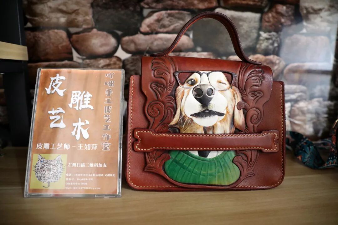 “我命由我不由天”,聋哑不但阻挡不了王如萍的步伐,反而成为她的垫脚石,没有了外界的喧嚣,她在安静的世界里专注雕刻。她绘画功底强,做出来的皮雕精美大方、惟妙惟肖。除了雕刻技艺精湛,热爱学习也是王如萍的一大标签。她利用钻研皮雕的空余时间,自学了计算机,现能掌握办公软件的处理技术。采访中,王如萍用微信和手语向我们介绍说道:“今年,我去青岛学习了两天瓷画,就像那边的那样。”她手指向瓷画作品,示意我们看。她只用了短短两天便学会,并能熟练地掌握瓷画雕刻的力度和精度,天赋惊人!