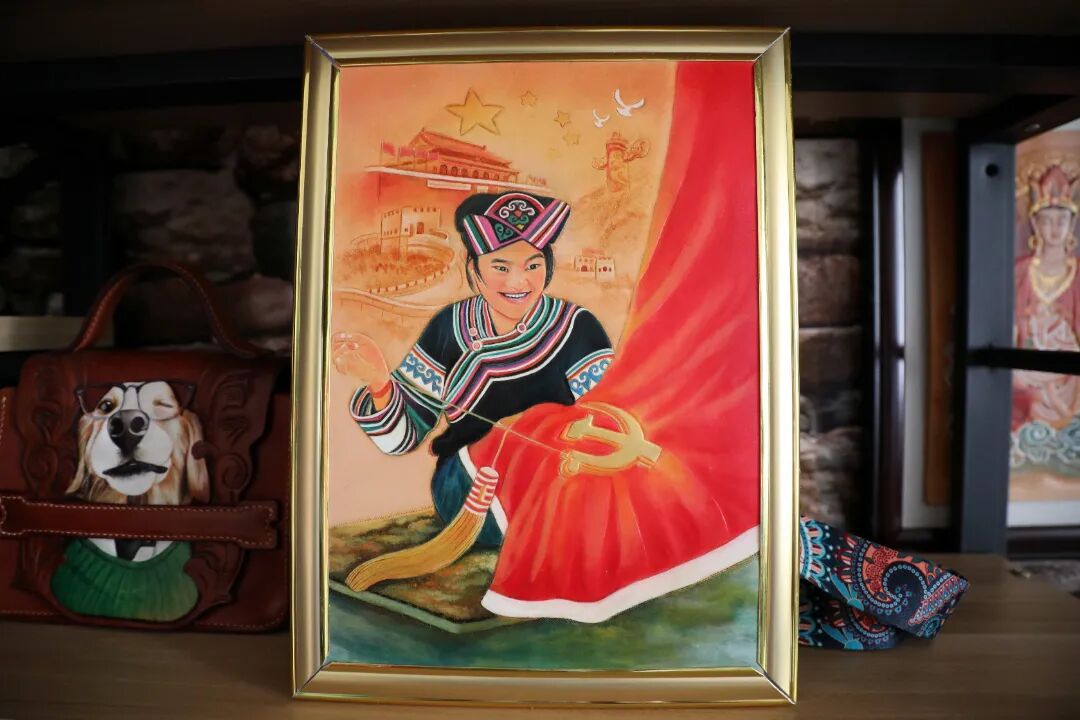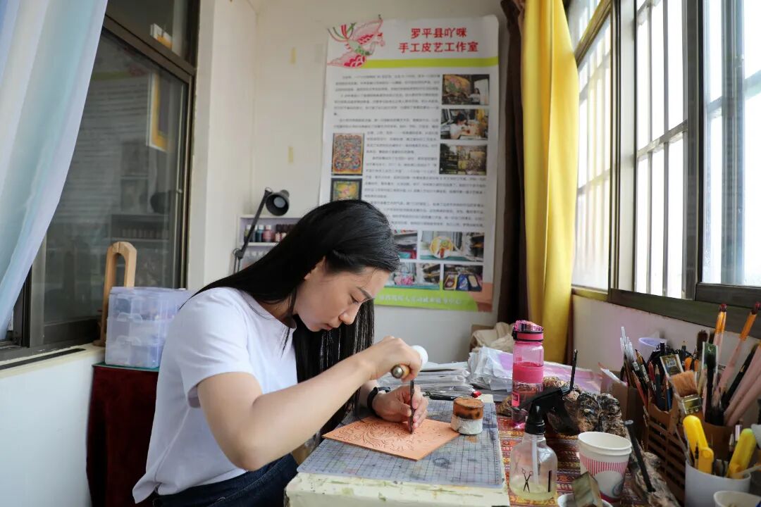 王如萍, 1991年生,共青团员,聋哑人,是罗平的一名皮雕艺术工作者。在建党百年之际,她历时一个月,精心创作了一幅《绣党旗》的皮雕作品,呈现罗平布依族女党员对党和国家的真挚热爱,彰显“边疆人民热爱党”的情怀,也表达残疾人感激党和政府的关怀与照顾。“今年是中国共产党建党一百周年华诞,我没有什么可贵的东西向党献礼,我就用手中的刻刀,雕出我心中要讲的话,向伟大的中国共产党建党一百周年献礼,作为一名残疾人也不能缺席。祝我们的党100周年生日快乐!也祝我们的祖国越来越好,越来越繁荣昌盛!”王如萍用手语比划着,神情甚是激动,看似有很多心里话要表达。