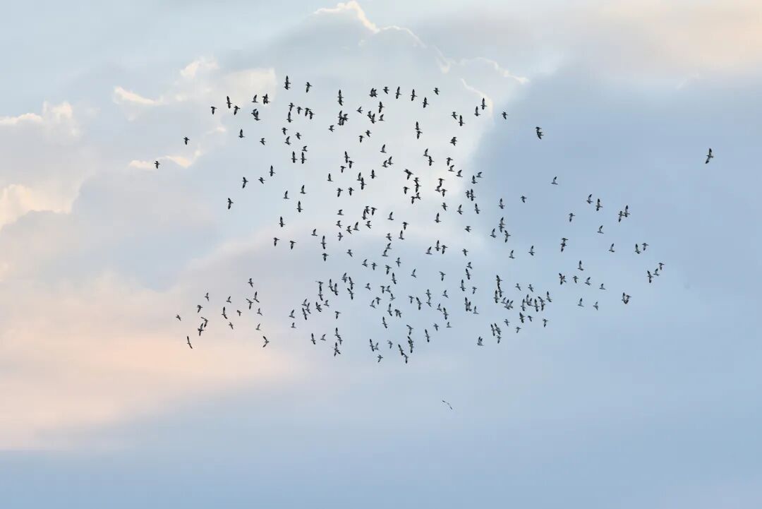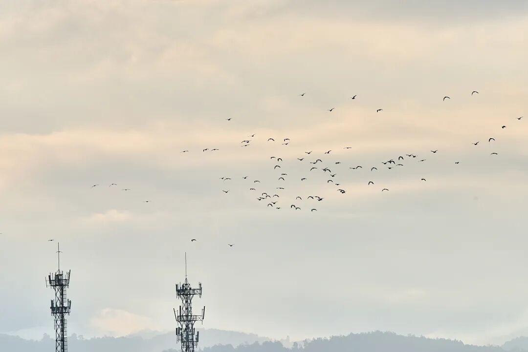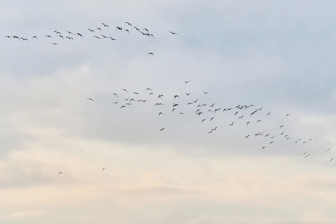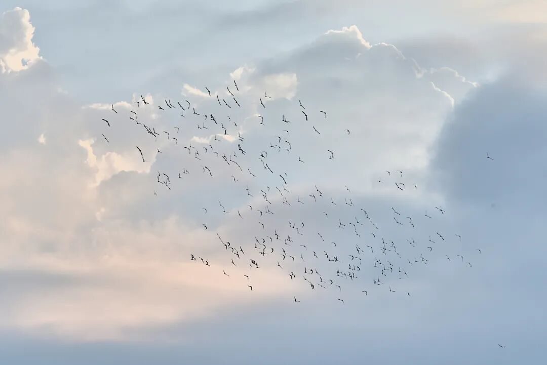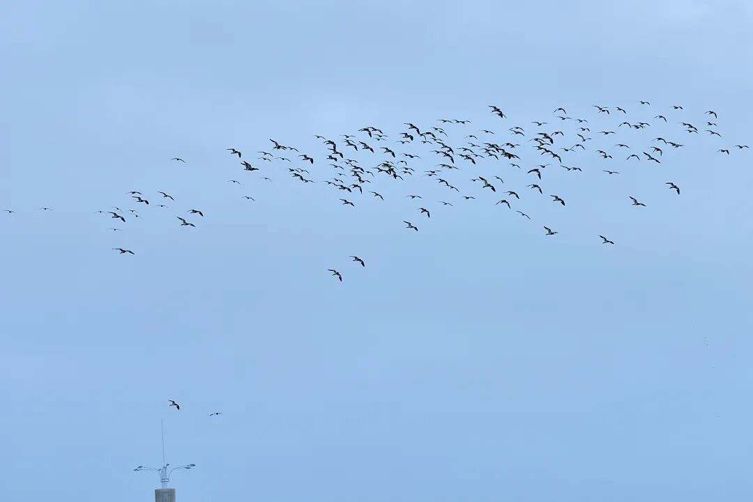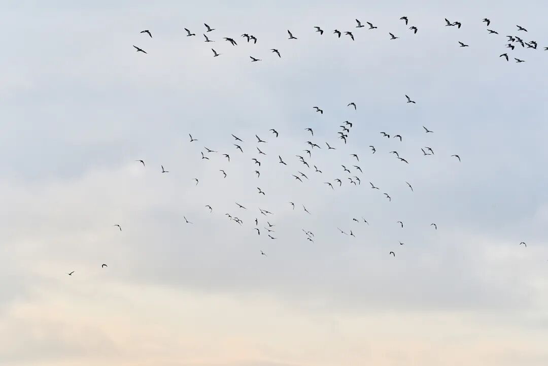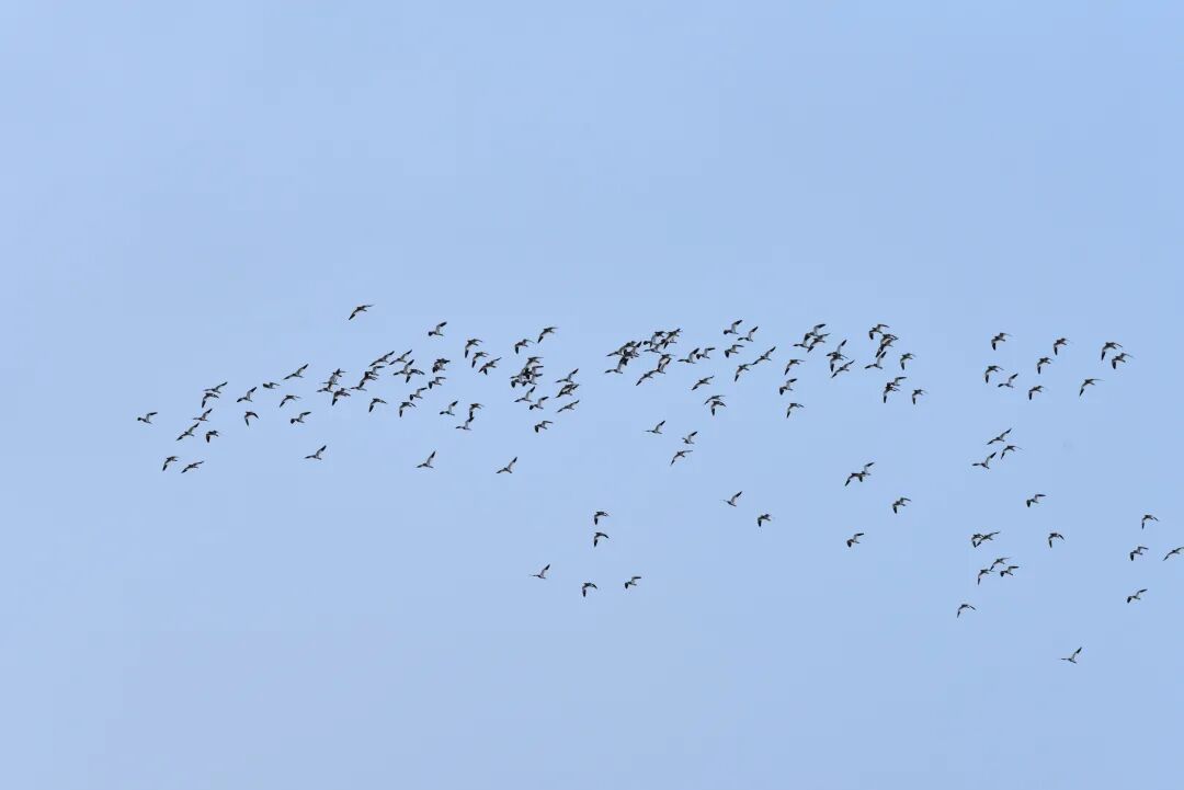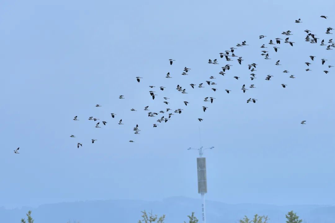 灰头麦鸡最活跃的时间,是朝阳初升后和夕阳西下前。这个时候,灰头麦鸡会集结好队伍,在天空翩翩飞翔,虽然没有“一会排成个人字,一会排成个一字”那么整齐划一,但自然放松的感觉,如散文诗般,既有韵律,又自然随意。