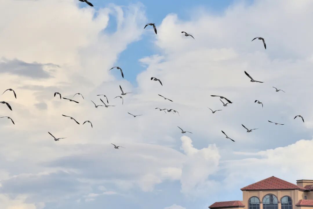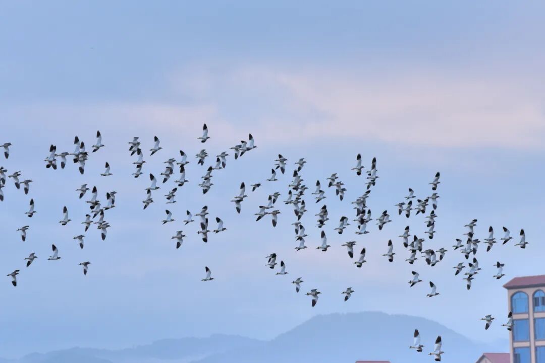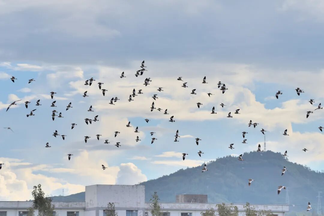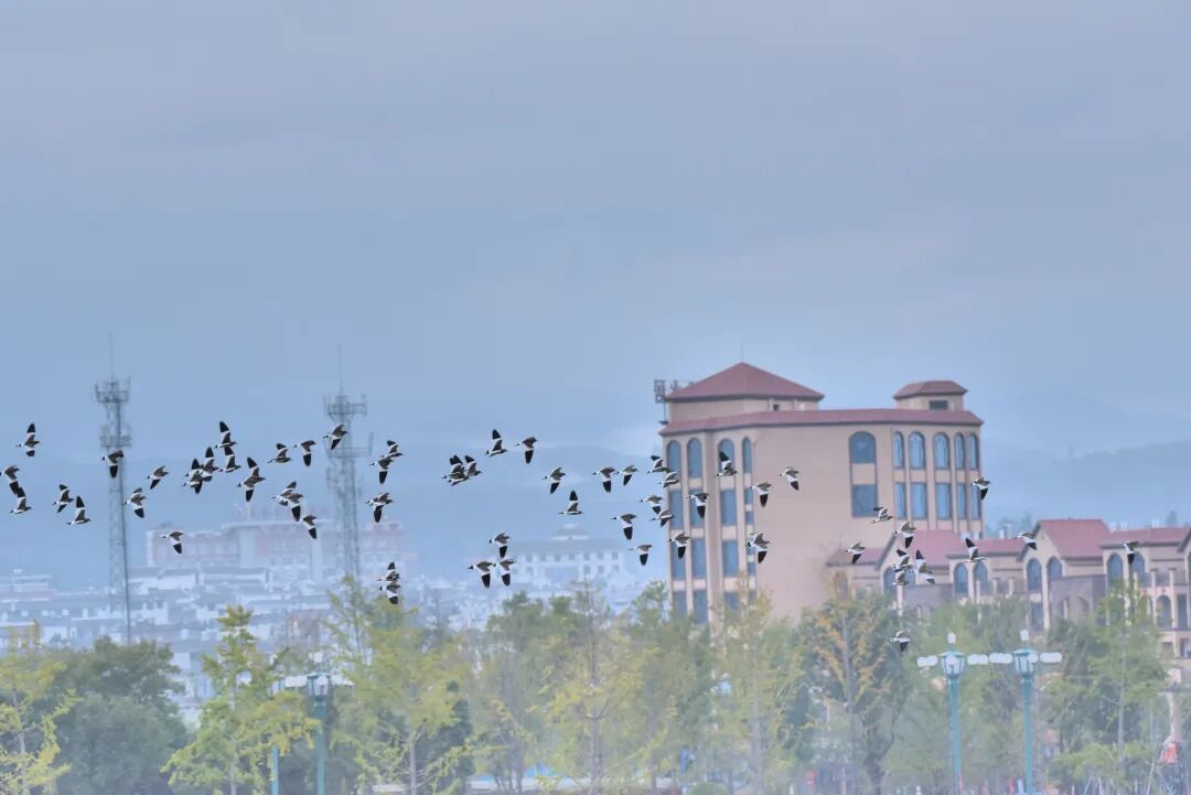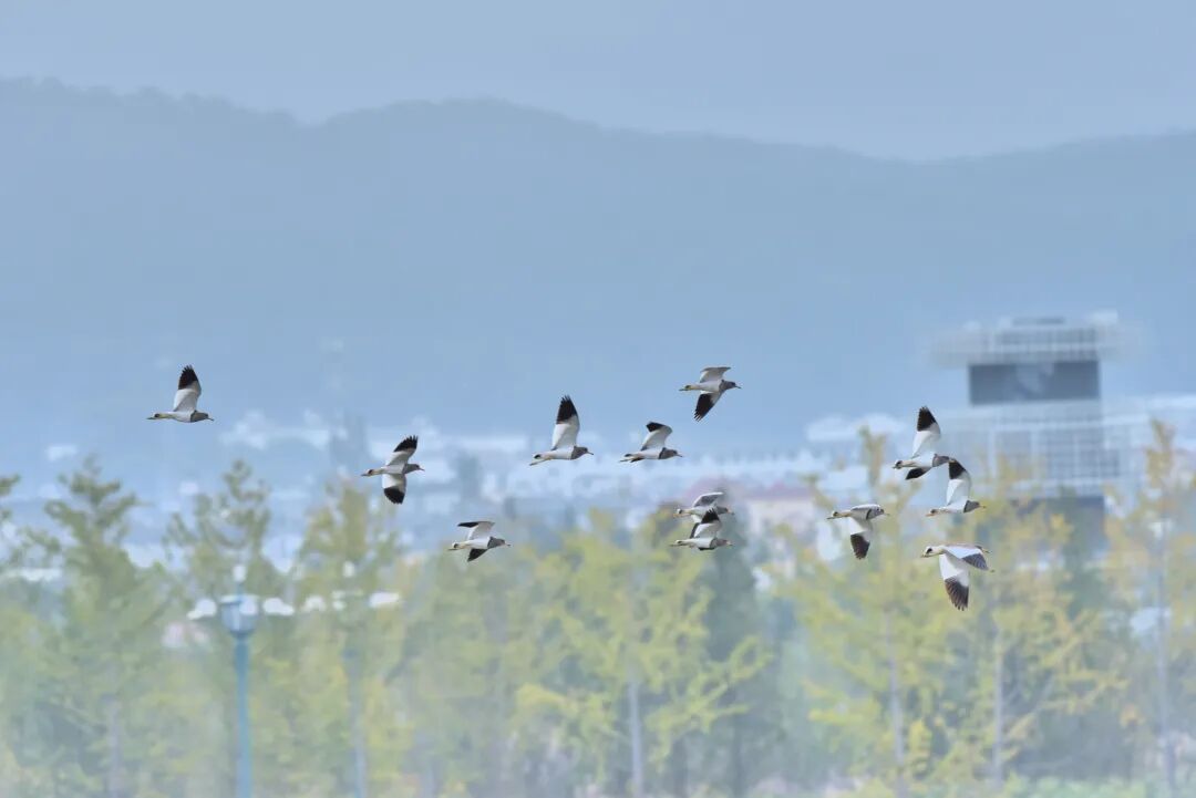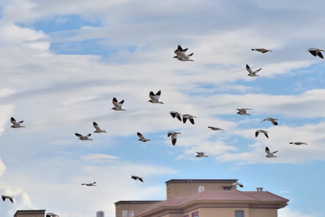 10月4日下午,在城北的水环境生态示范园旁,一大群灰头麦鸡在那里,时而飞过公园,时而掠过屋顶,时而又落入公园边的泥沙地,自由自在,快乐轻松。