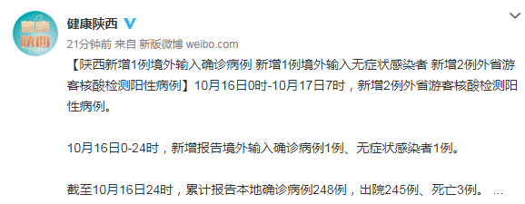 “健康陕西”微博信息显示,10月16日0时—10月17日7时,陕西新增2例外省游客核酸检测阳性病例。