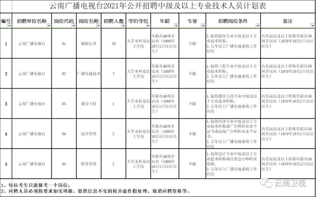 附件:云南广播电视台2021年公开招聘中级及以上专业技术人员计划表
