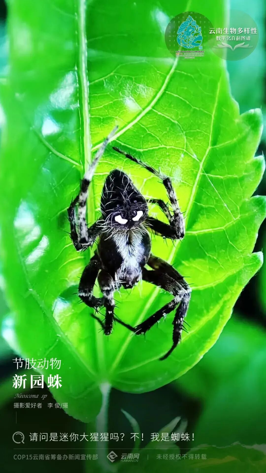 新园蛛属,隶属于节肢动物门,蛛形纲,蜘蛛目,园蛛科,新园蛛属。栖息于植被茂密的林间,常在树枝或灌木之间织圆形蛛网,用守株待兔的方式捕捉空中飞行的昆虫。照片摄于普洱。