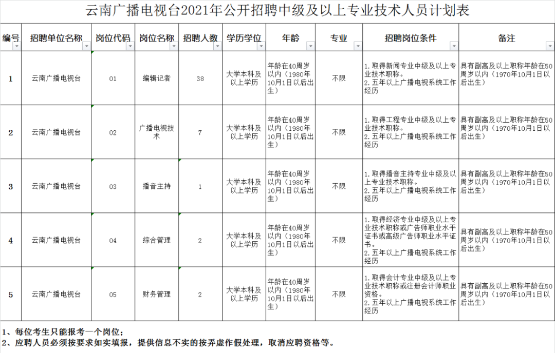 云南广播电视台2021年面向社会公开招聘中级及以上专业技术人员公告