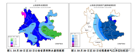 10月20日开始,新一股冷空气将接踵而来。受冷空气影响,20日,云南中东部及怒江北部有小到中雨局部大雨。21-22日云南中西部有中到大雨局部暴雨、大暴雨,其它地区有小到中雨局部大雨。过程累积雨量20~40毫米,其中滇西北、滇西边缘和滇西南东部60~80毫米,怒江北部局地可达100毫米以上。冷空气自东向西影响期间,中东部最高气温将普遍下降4~8℃,局地下降10~12℃。迪庆北部、怒江北部高海拔地区可能出现降雪或雨夹雪天气。【详情】