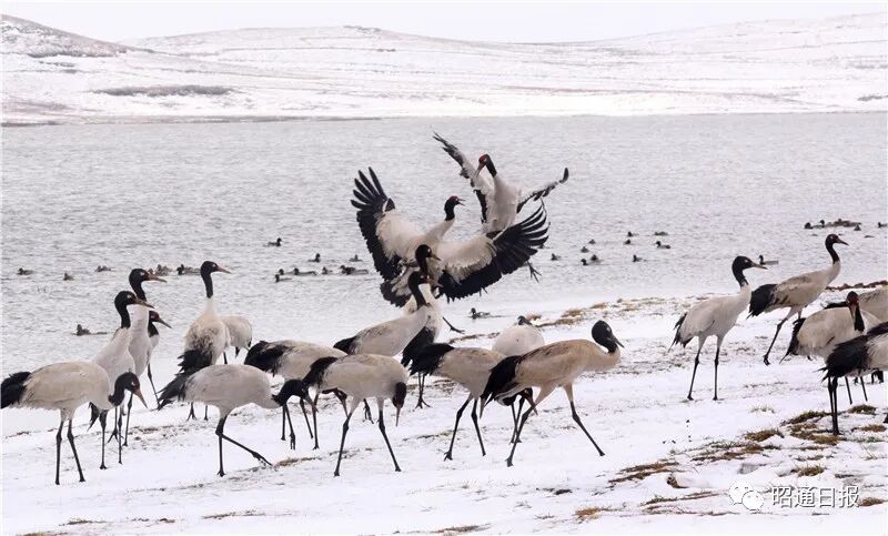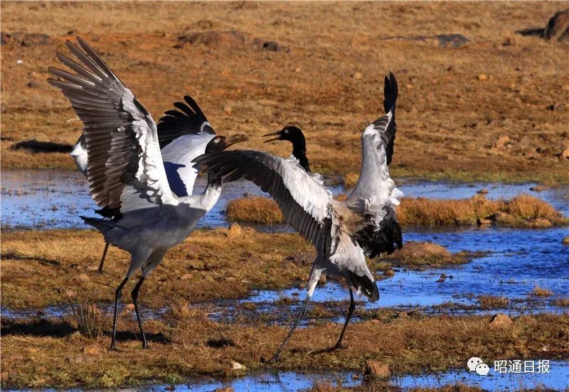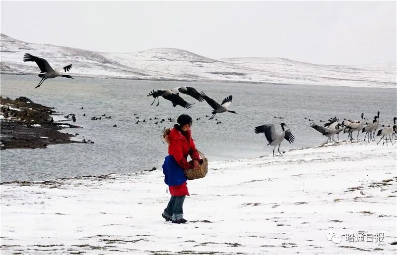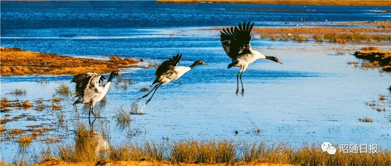 黑颈鹤生活在高原的沼泽地带,以洋芋、青稞等植物性食物为主,也会吃小鱼、泥鳅等动物性食物。而高原上生活严酷,食物短缺,加之幼鹤成活率低,所以黑颈鹤的数量很少,成为了珍贵的“鸟类熊猫”。平均海拔3000多米、作为黑颈鹤重要越冬栖息地之一的昭通大山包湿地,每年农历九月,数千只黑颈鹤就会准时从遥远的青藏高原迁徙到这里越冬,人鹤共处,成为高原上最美丽的风景线。