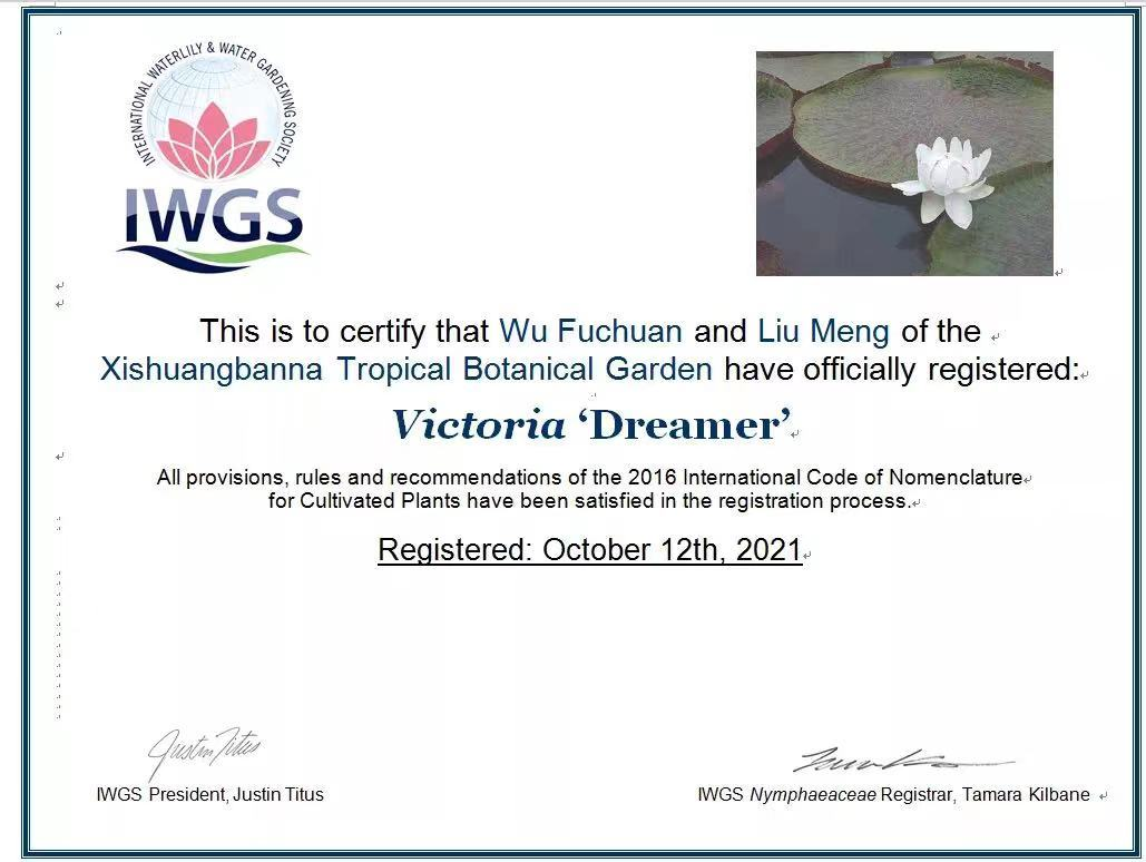 近日,由西双版纳植物园吴福川高级实验师、刘勐工程师培育的王莲新品种Victoria ‘Dreamer’(追梦人)获得新品种登录注册权威机构的认可,收到新品种登录注册证书,这是我国首个获得国际权威机构认证的王莲新品种。新品种(追梦人)是利用亚马逊王莲萌芽露白的种子,经过人工诱变选育而来。2018年开始,版纳植物园就对其进行栽培培育实验,观察相关性状是否稳定,经过近4年的栽培培育观测,其性状独特、表现稳定。