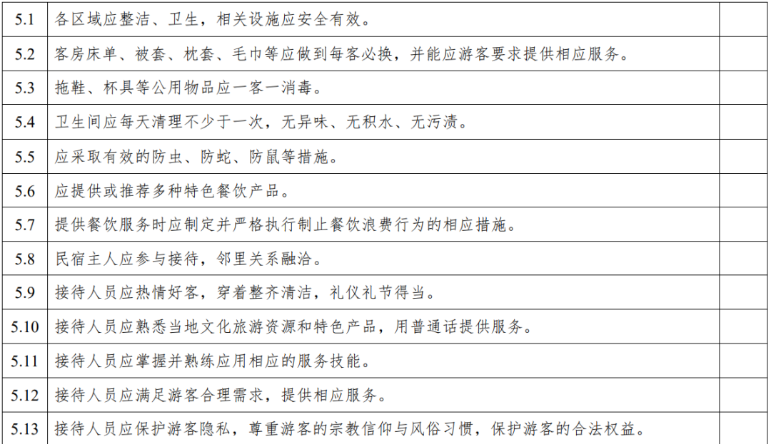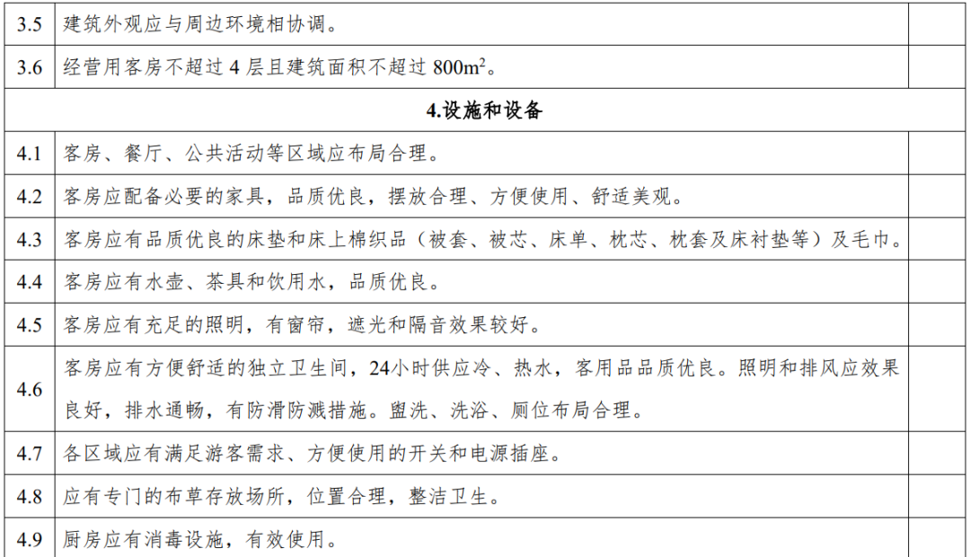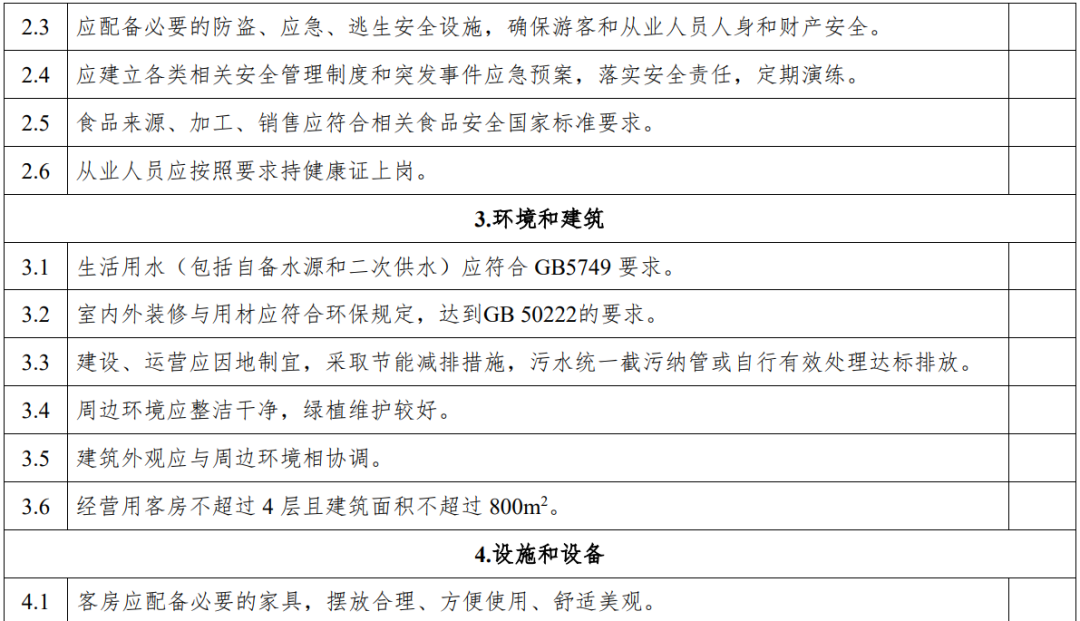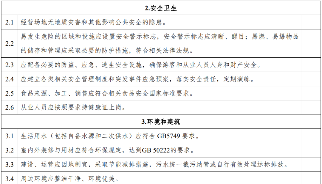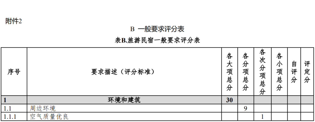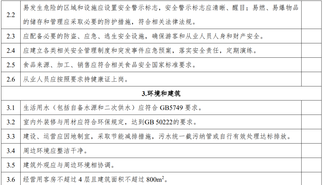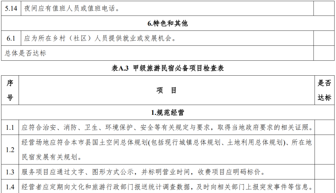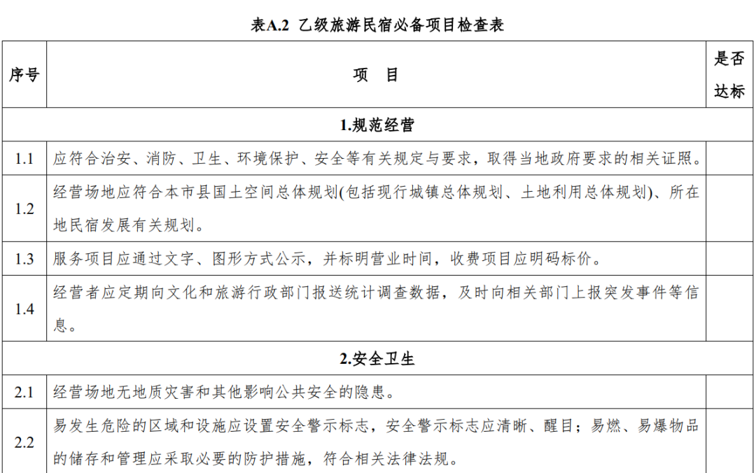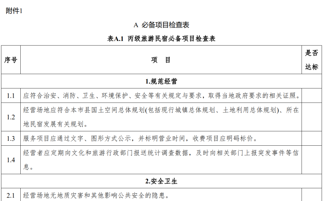 (一)附件1“A 必备项目检查表”。该表分别规定了丙级、乙级、甲级旅游民宿的必备项目,申报相应等级的旅游民宿每个项目应达标。