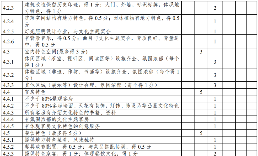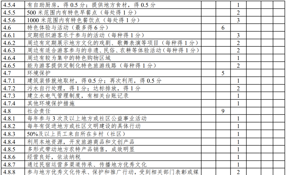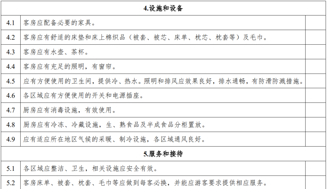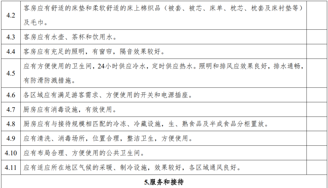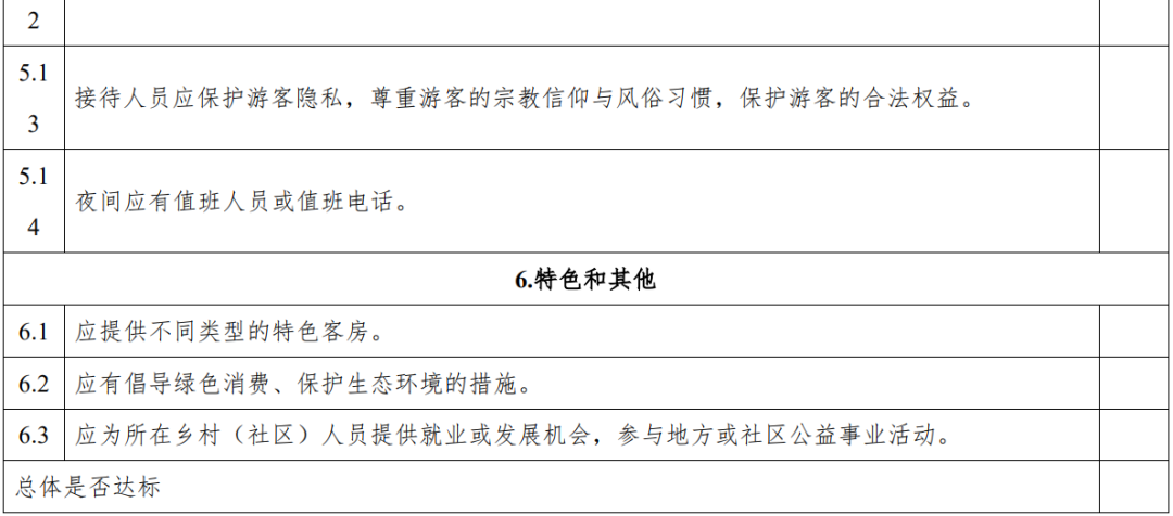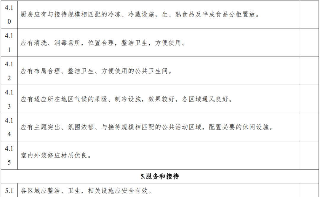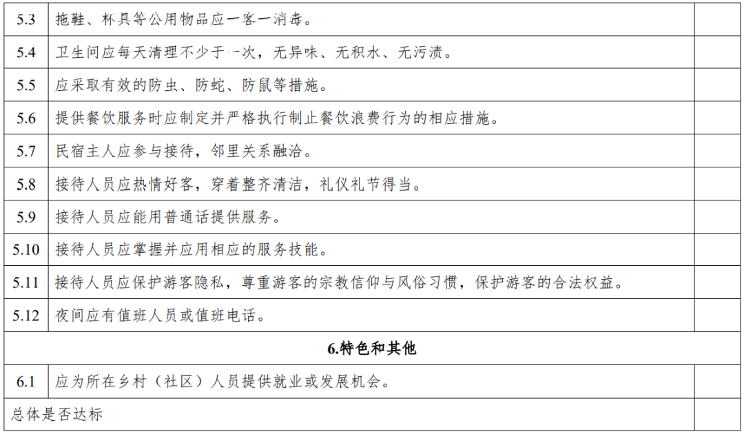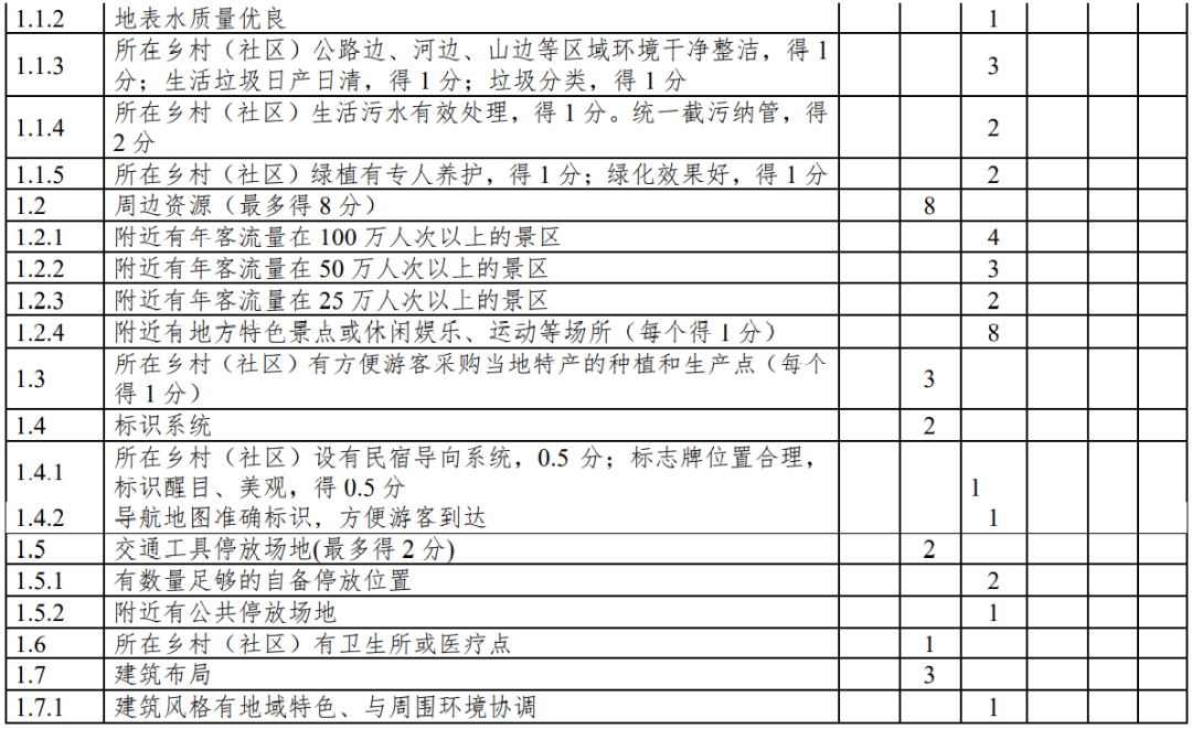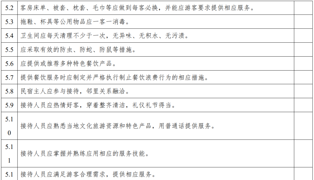 (一)附件1“A 必备项目检查表”。该表分别规定了丙级、乙级、甲级旅游民宿的必备项目,申报相应等级的旅游民宿每个项目应达标。