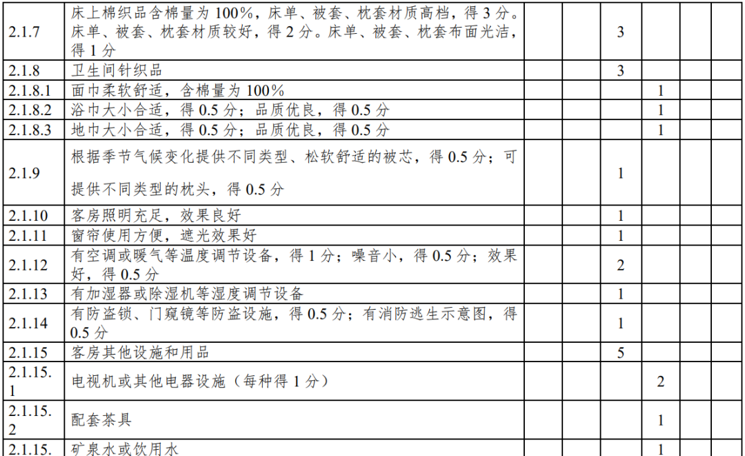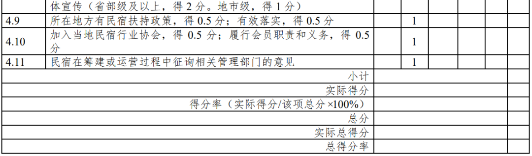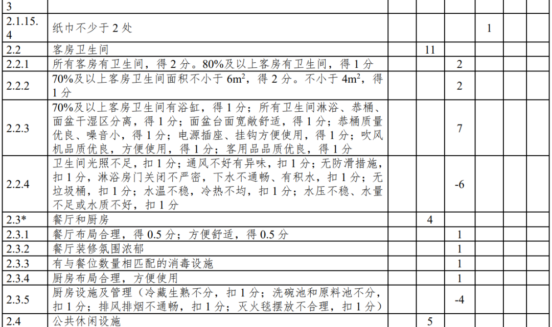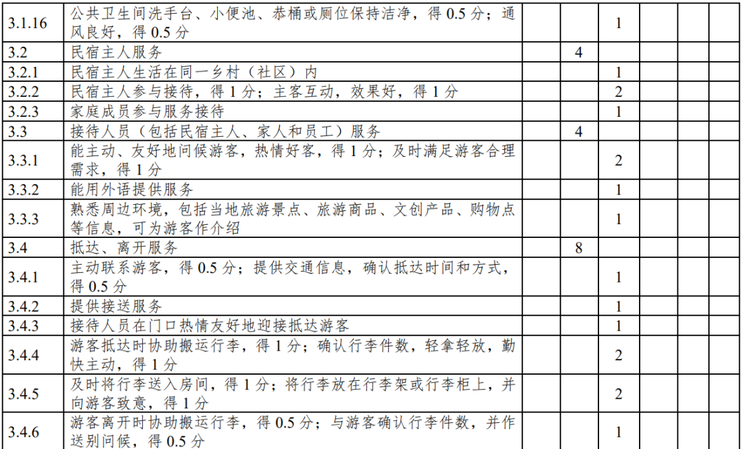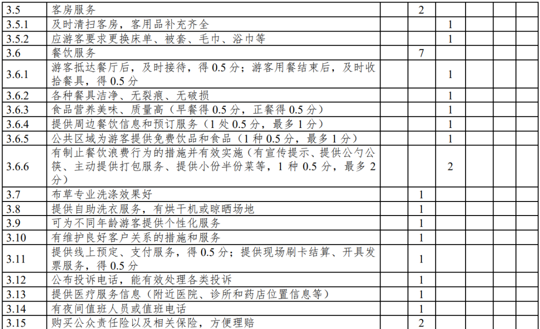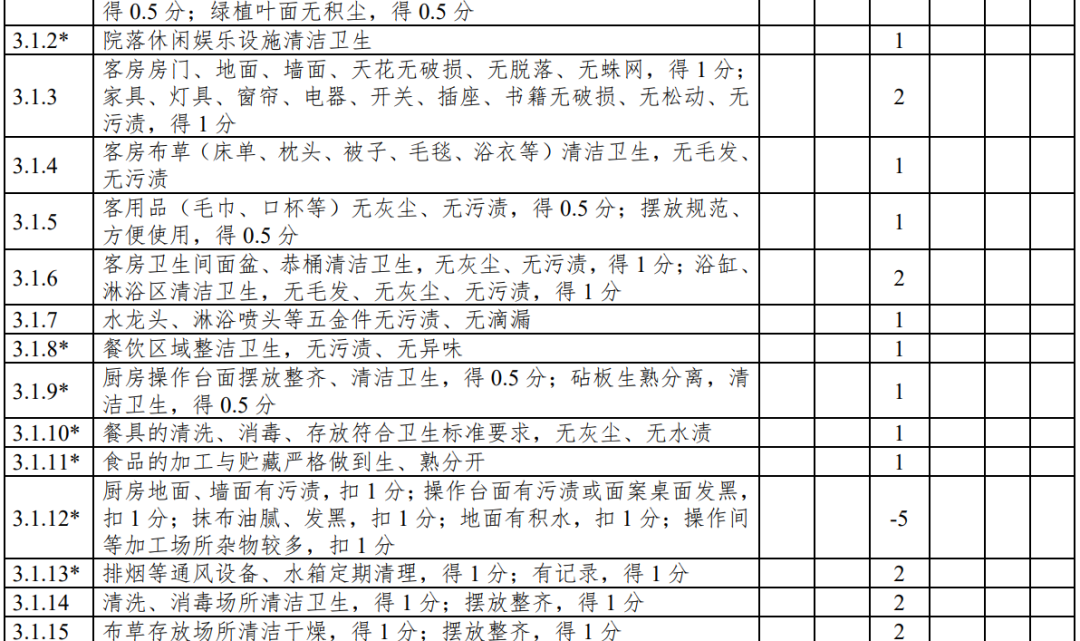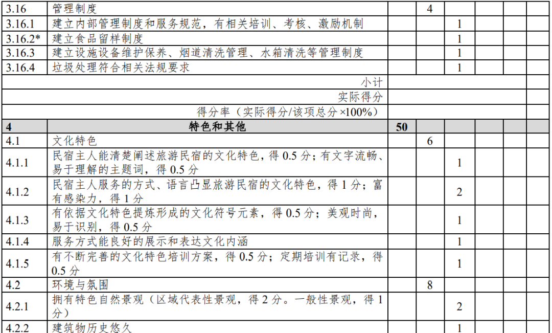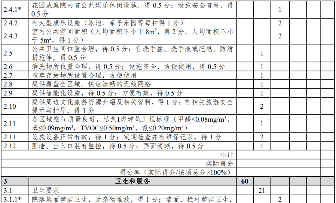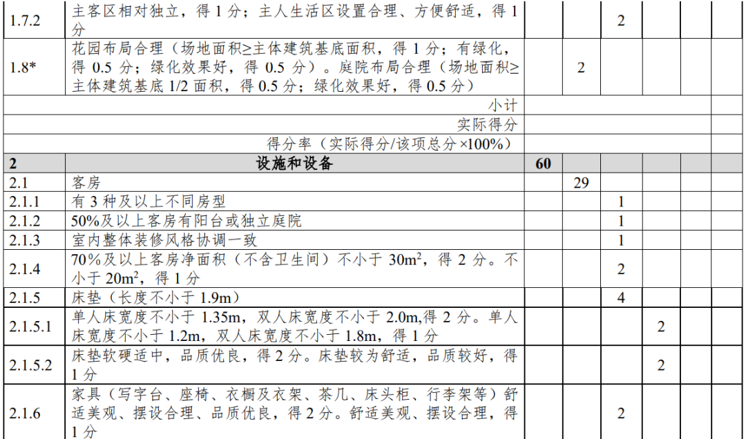 注:如旅游民宿不具备附录 B 中带“*”的项目,评定机构从游客需求出发,根据地方客观情况审核,如确实不需要或不可能提供,可在统计该项得分率时在分母中去掉该项分值。